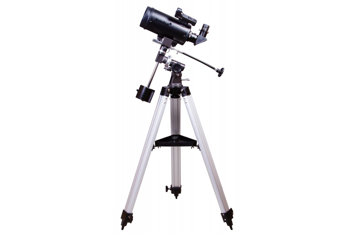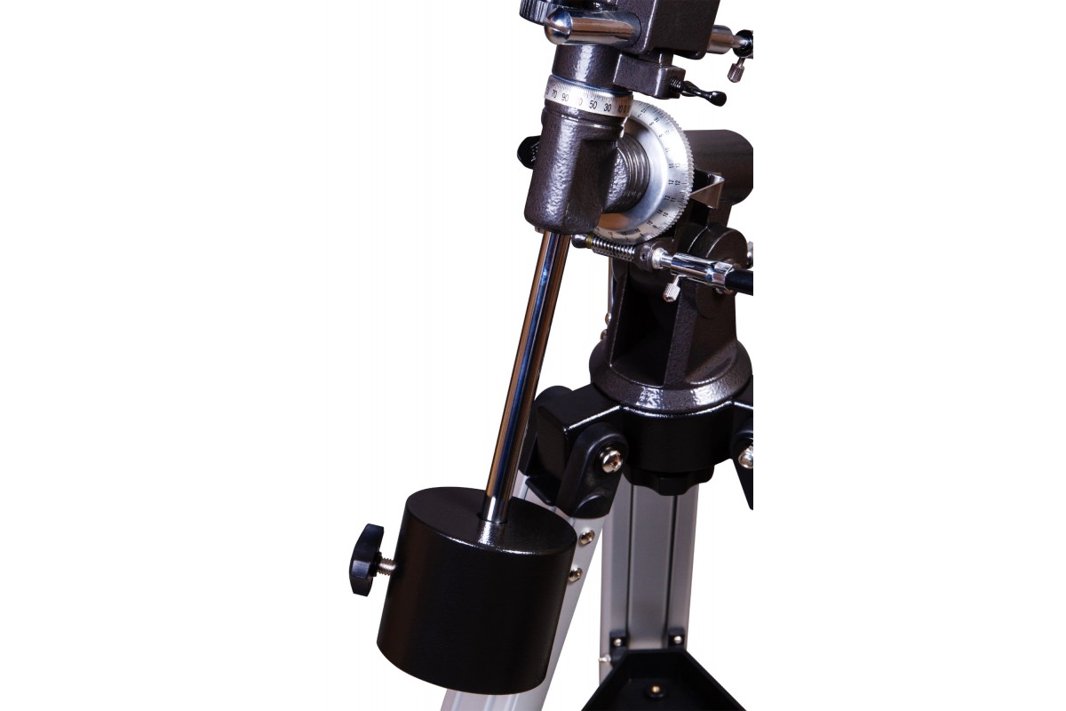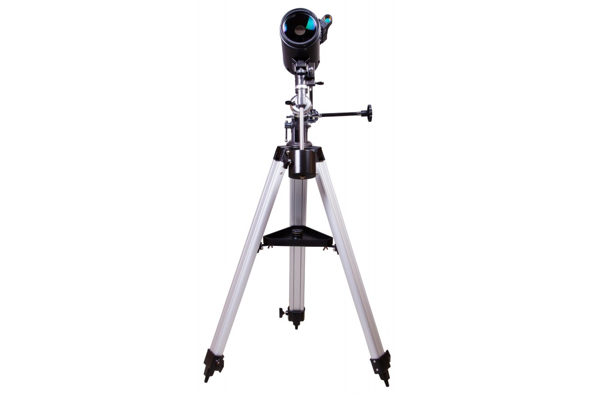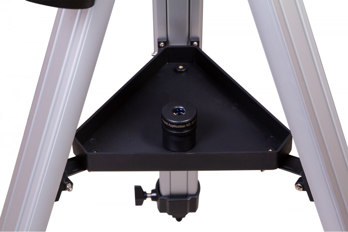 Экваториальная монтировка управляется при помощи ручек тонких движений. Следить за движением небесных тел удобно и легко. Монтировка крепится к алюминиевой треноге. На нее устанавливается лоток для аксессуаров. Высоту ножек треноги можно регулировать.