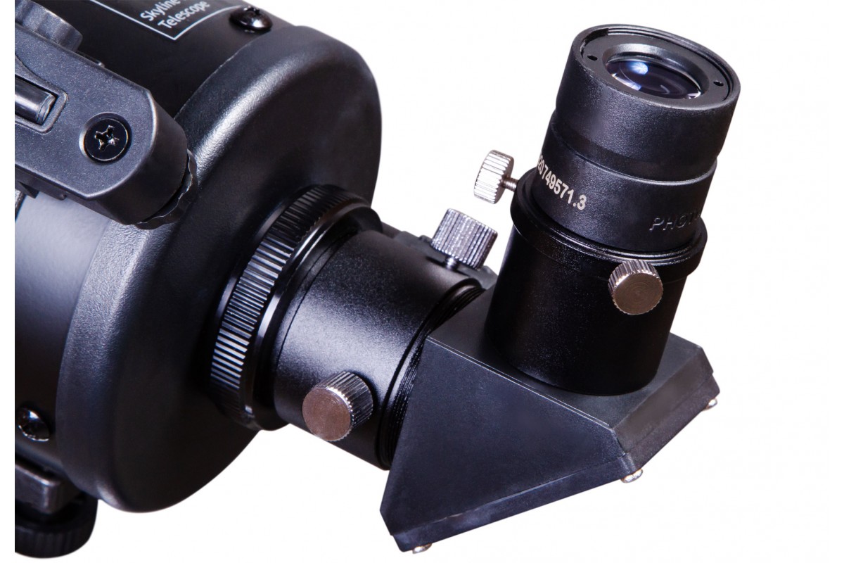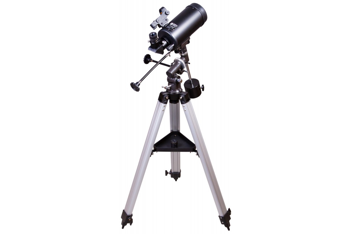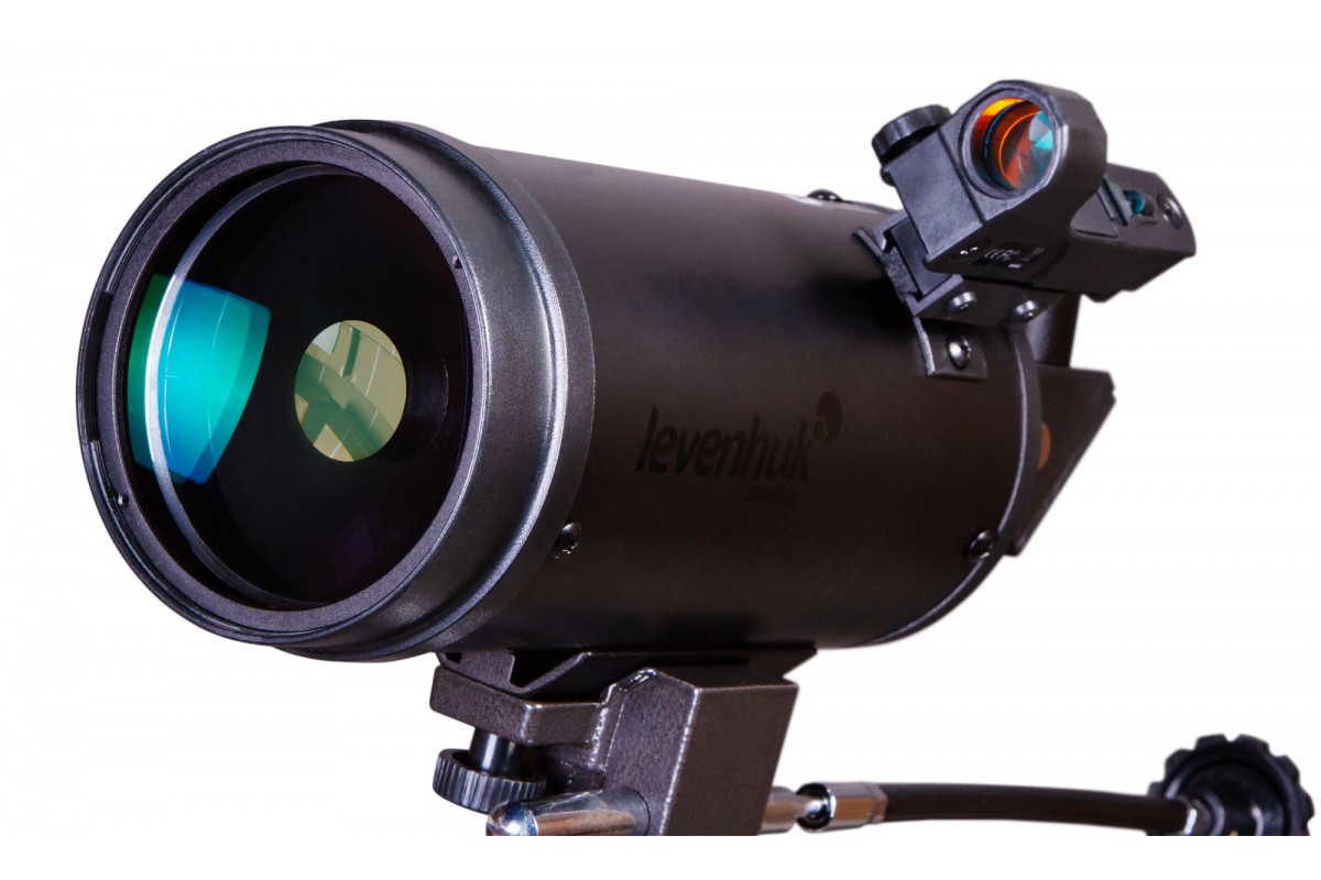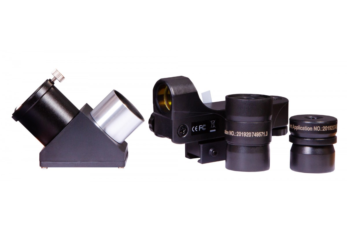 Телескоп собран по зеркально-линзовой схеме. А это значит, что в нем сочетаются компактная конструкция и отличные оптические возможности. Этот телескоп можно поставить на лоджию, с ним удобно путешествовать. Из оптических аксессуаров в комплект поставки включены два разнофокусных окуляра и диагональное зеркало. Последнее используется для наземных наблюдений. Для наведения на астрономические объекты применяется искатель с красной точкой.