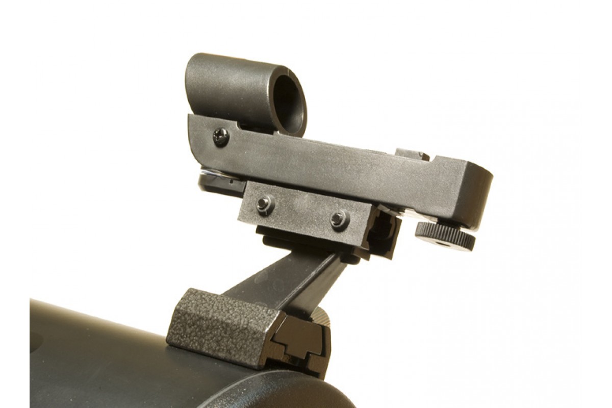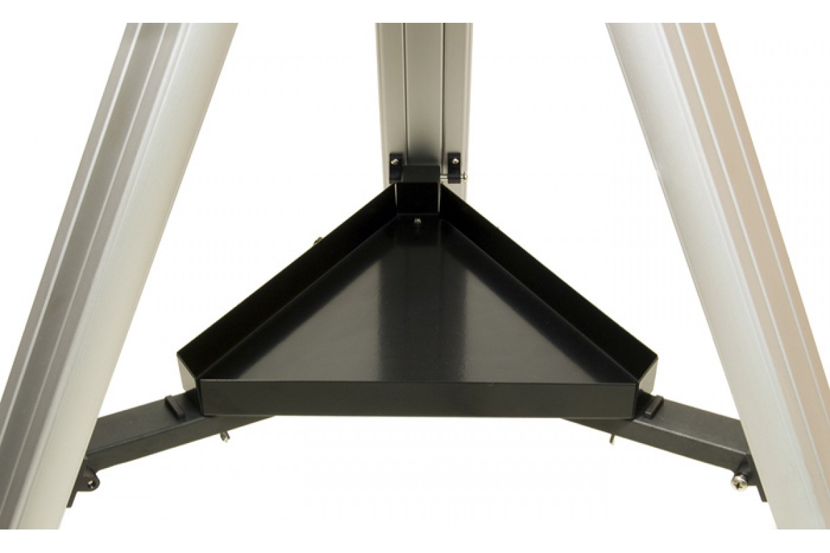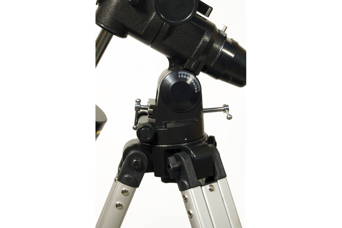 Данная модель комплектуется двумя окулярами: 10 мм (150x) и 25 мм (60x). Для поиска астрономических объектов используется искатель с красной точкой. Труба установлена на экваториальную монтировку. Высота треноги регулируется.