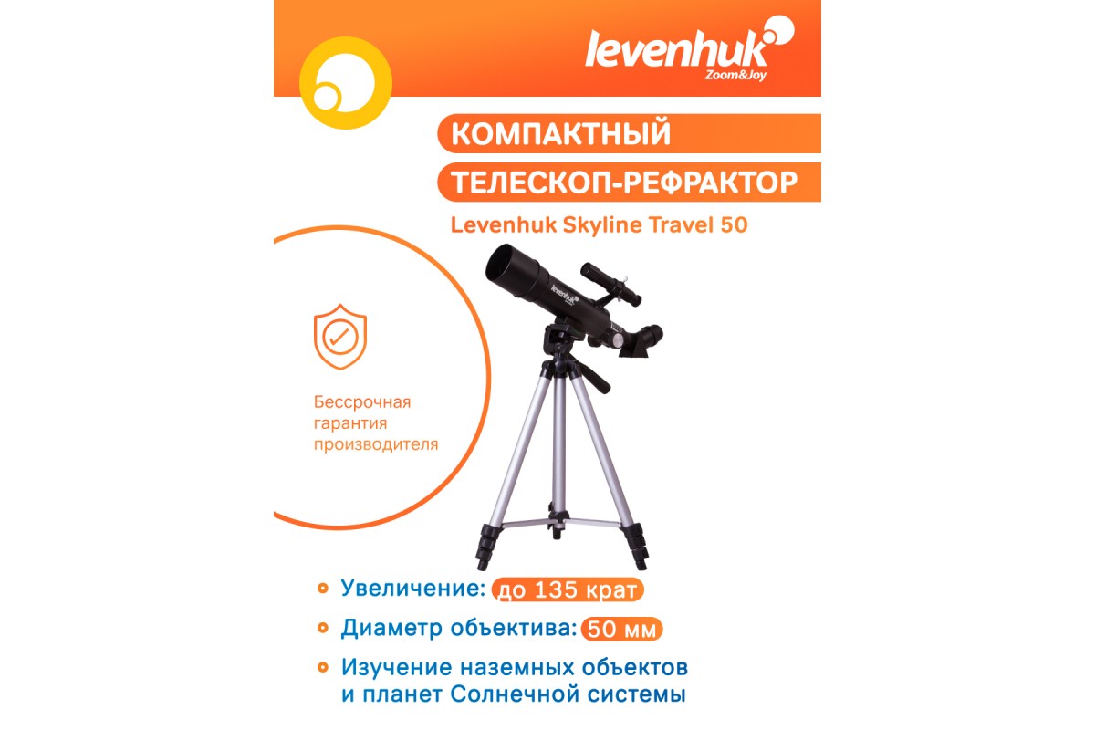 Levenhuk Skyline Travel 50 – прекрасный выбор для загородных наблюдений, походов и выездов на природу всей семьей.