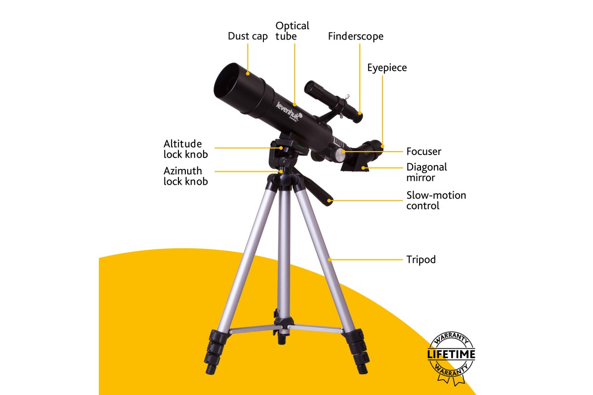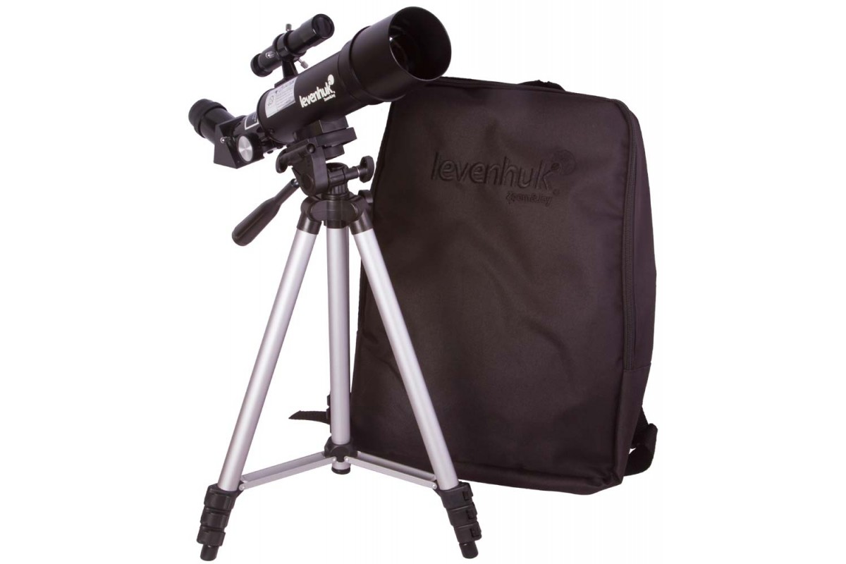 Оптическая труба установлена на азимутальную монтировку. Сама труба компактная и легкая – она в два короче, чем у большинства других рефракторов. Управлять телескопом легко, никакой первичной настройки не требуется. Для наведения на объект нужно лишь перемещать ее по азимуту и высоте. Тренога алюминиевая, регулируемая по высоте. В комплект поставки включен и удобный рюкзак для переноски телескопа. Благодаря облегченной конструкции путешествовать с телескопом сможет даже ребенок.