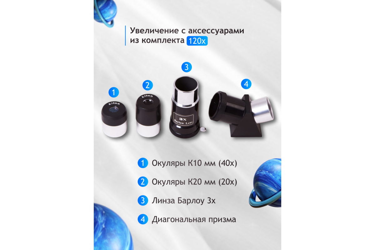 - Окуляры в комплектеK10 мм (40x), K20 мм (20x)