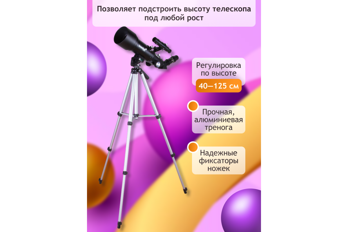 Телескопом легко управлять при помощи азимутальной монтировки. Ее можно перемещать или по высоте, или по азимуту. Направить оптическую трубу на объект сможет даже ребенок. Она почти в два раза короче, чем у большинства других рефракторов. А вес конструкции максимально снижен, при этом сохранены все оптические возможности. Для наблюдений используется классическая алюминиевая тренога. Высоту ее ножек можно регулировать, адаптируя телескоп под рост пользователя.