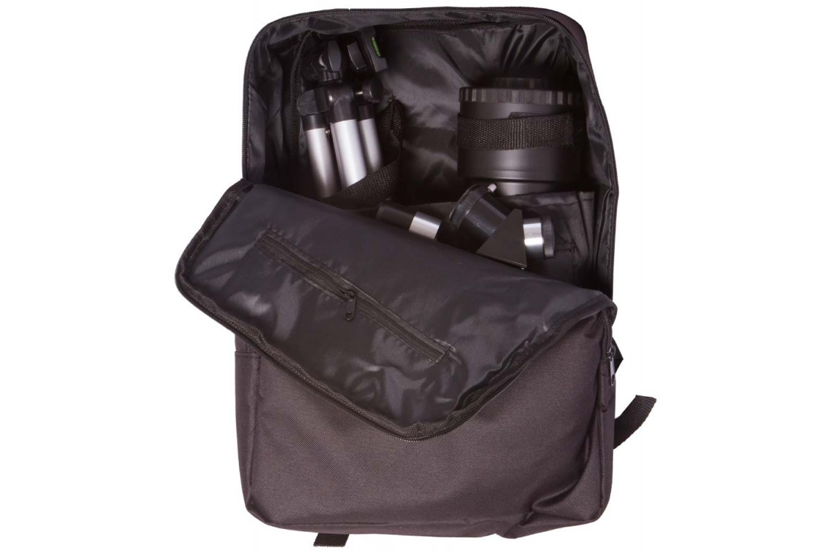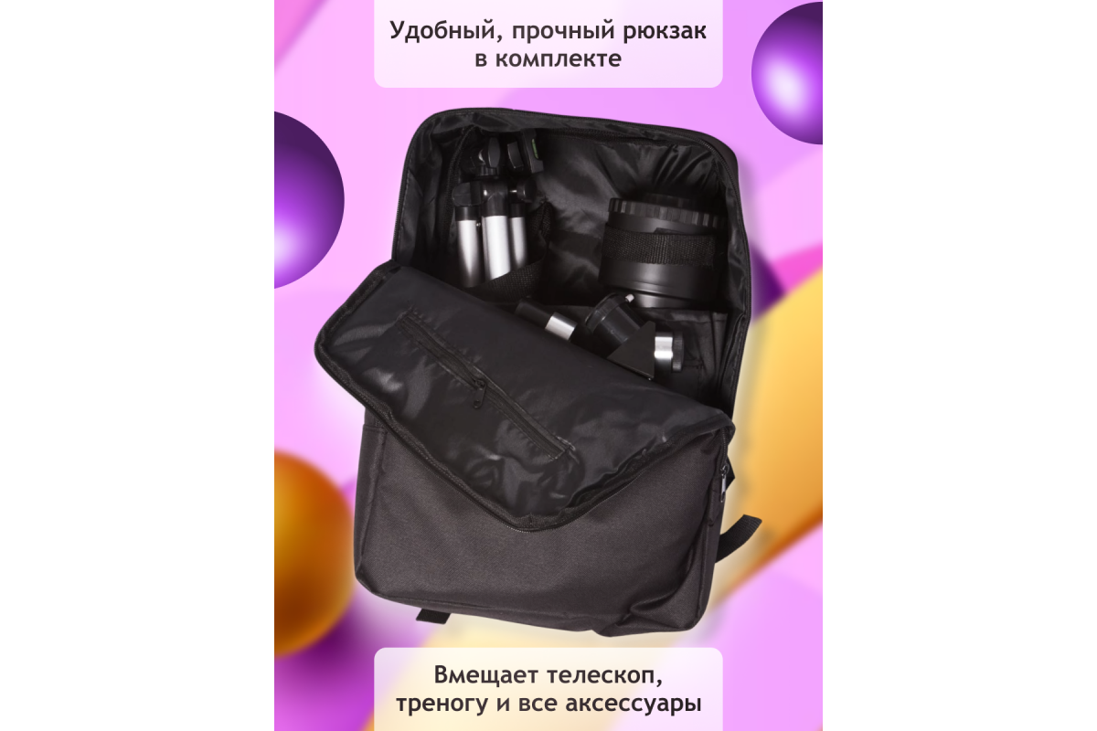 В комплект включены все необходимые аксессуары: окуляры, оптический искатель, линза Барлоу и диагональная призма. Увеличение «из коробки» составляет 120 крат. Есть и удобный рюкзак, с помощью которого вы легко довезете телескоп до любой точки наблюдений.