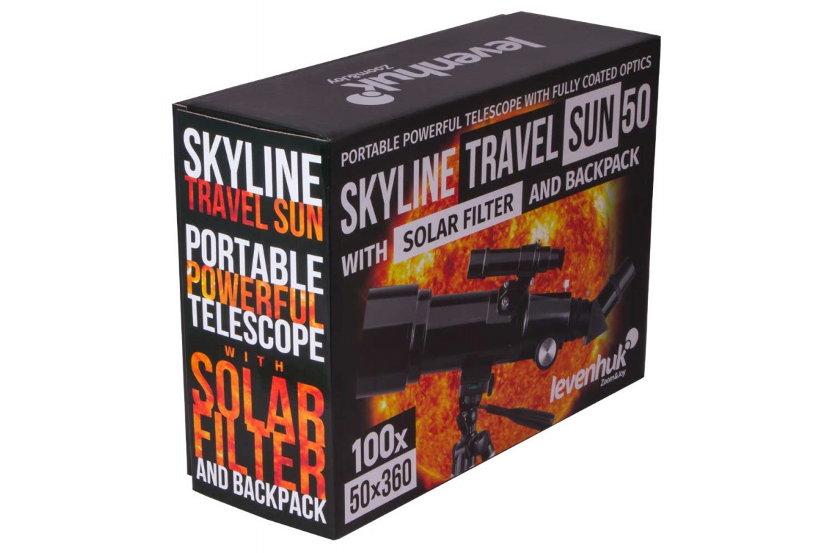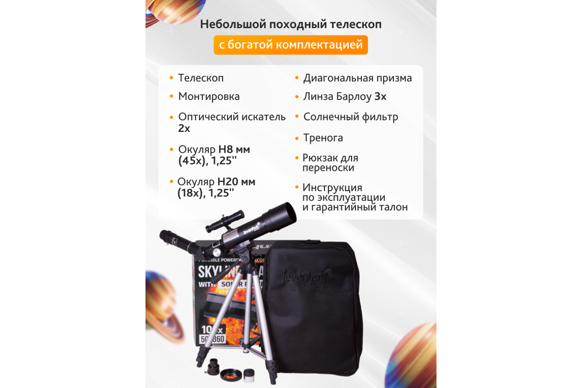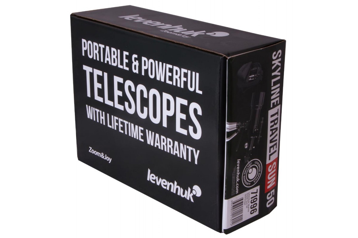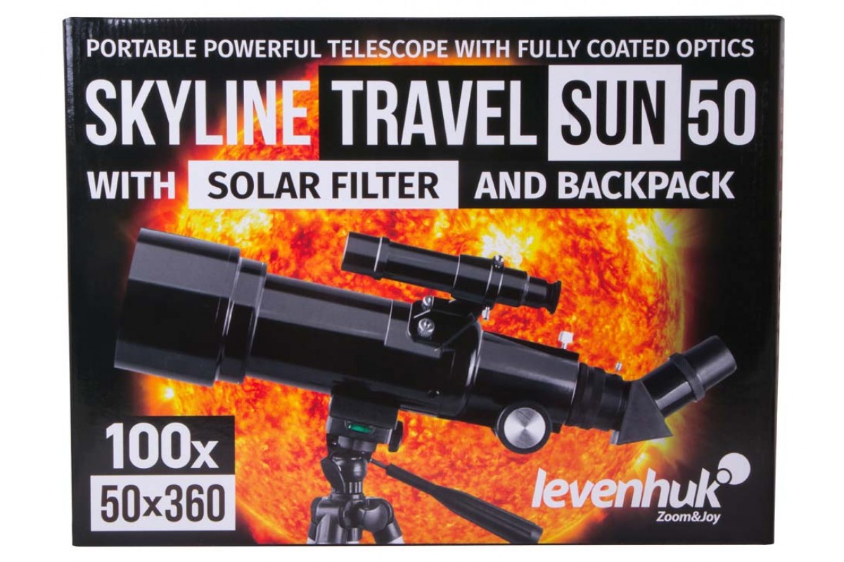 Levenhuk Skyline Travel Sun 50 – компактный рефрактор начального уровня с качественной оптикой и обширной комплектацией. Легкий и удобный телескоп можно смело доверить школьнику – это простая и надежная модель на азимутальной монтировке с устойчивой алюминиевой треногой. Телескоп лучше всего подойдет для наблюдений за Луной и планетами Солнечной системы, а также для ландшафтных наблюдений. Самые яркие объекты дальнего космоса будут видны в виде светящихся точек.