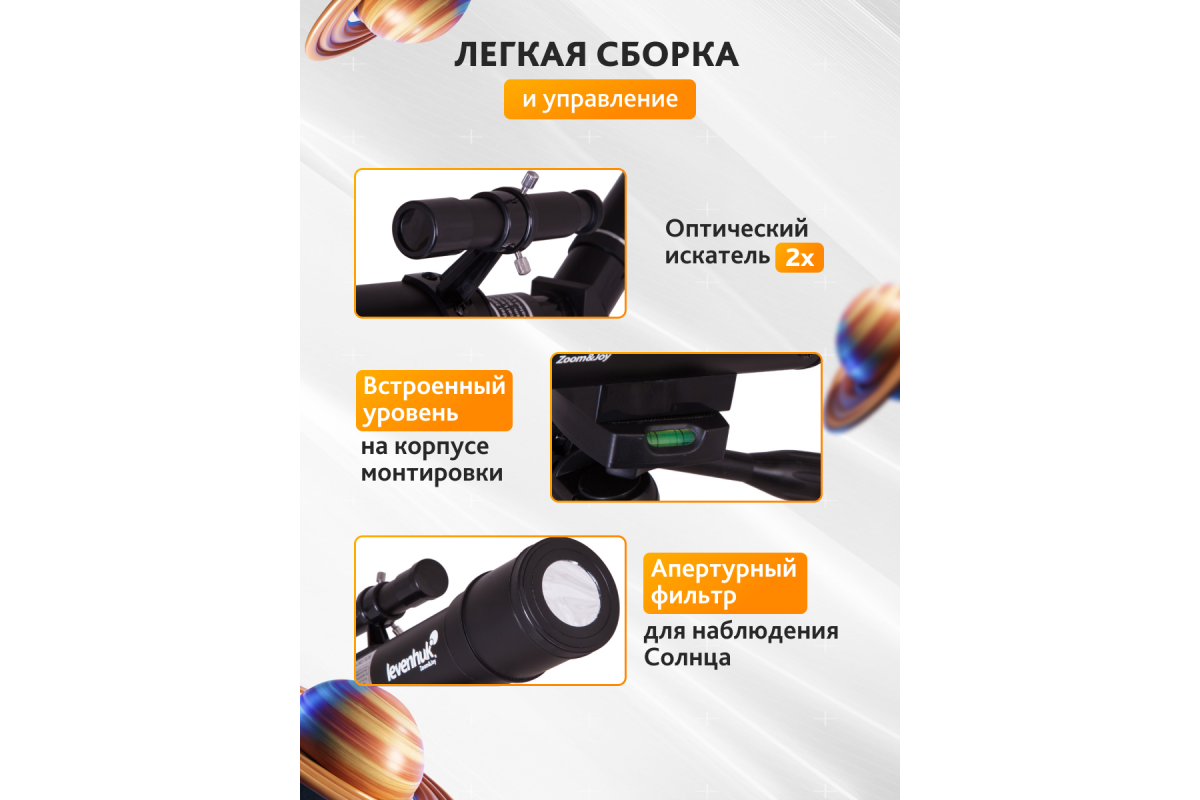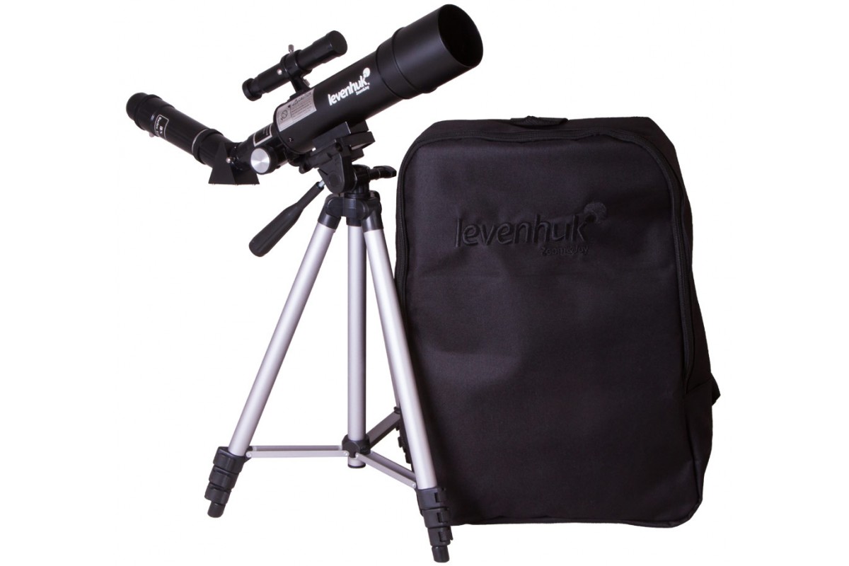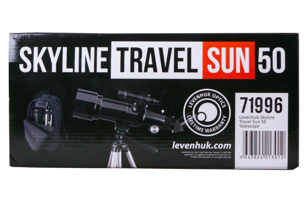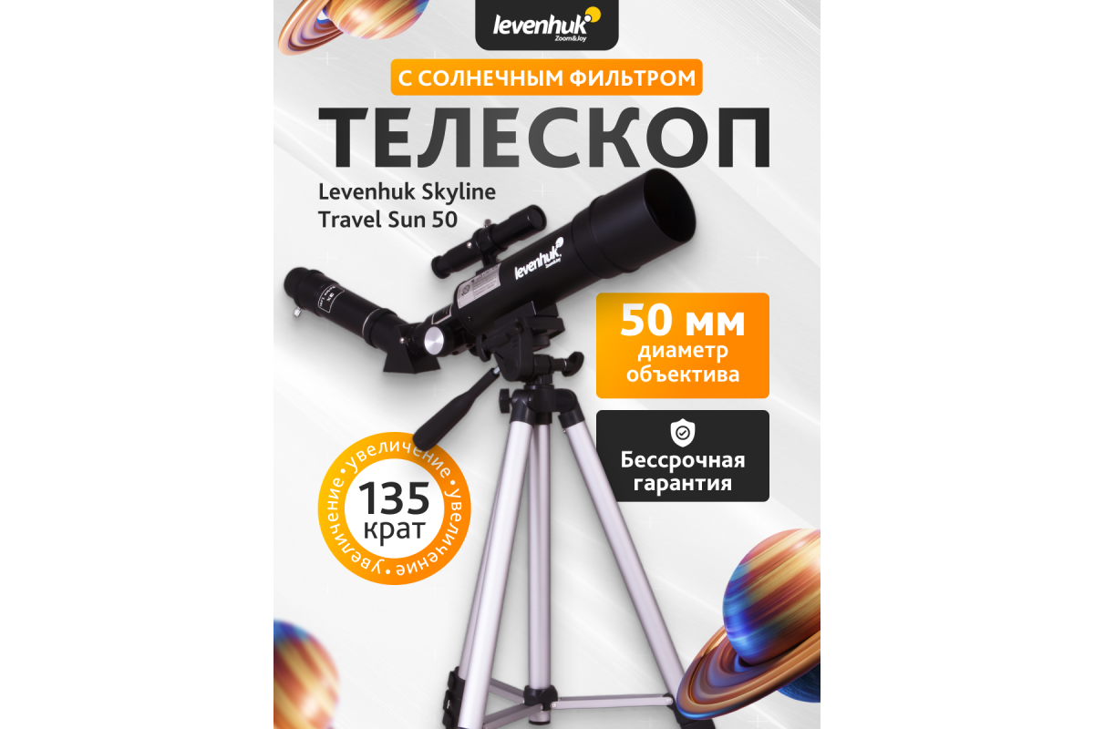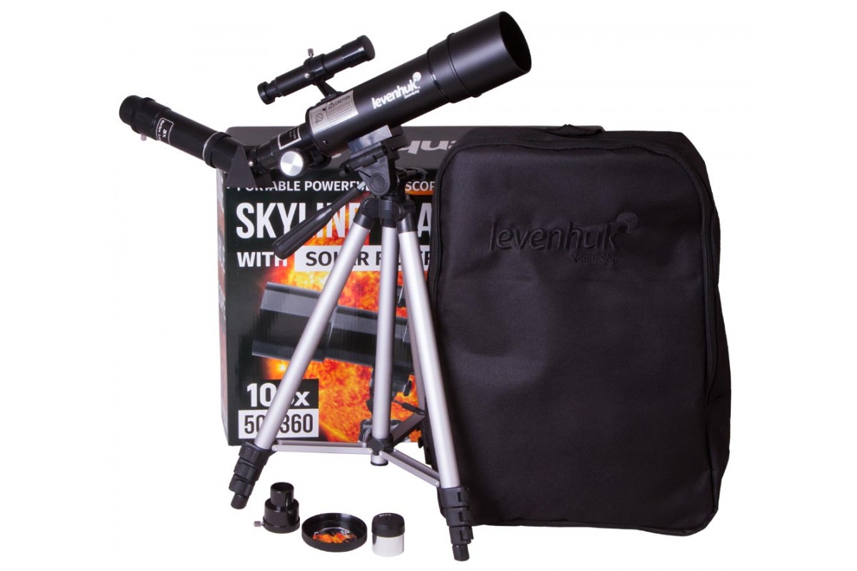 Levenhuk Skyline Travel Sun 50 – компактный рефрактор начального уровня с качественной оптикой и обширной комплектацией. Легкий и удобный телескоп можно смело доверить школьнику – это простая и надежная модель на азимутальной монтировке с устойчивой алюминиевой треногой. Телескоп лучше всего подойдет для наблюдений за Луной и планетами Солнечной системы, а также для ландшафтных наблюдений. Самые яркие объекты дальнего космоса будут видны в виде светящихся точек.