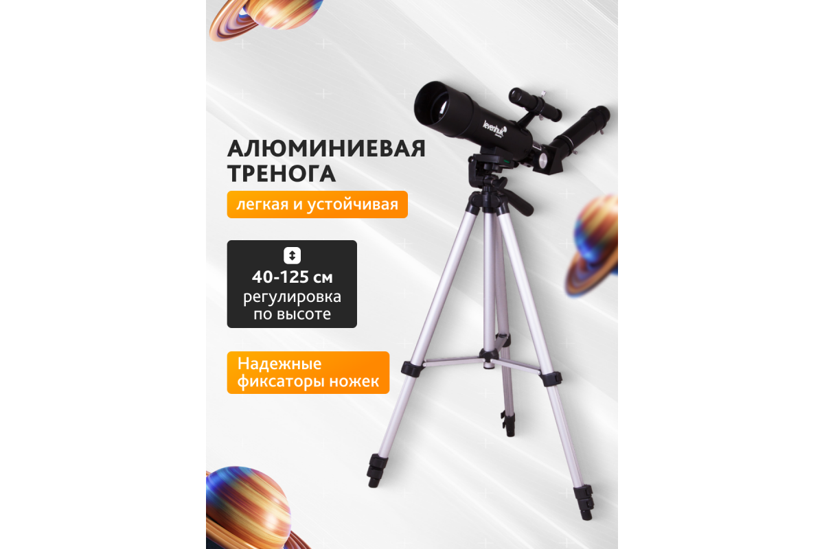 Труба телескопа устанавливается на легкую азимутальную монтировку. Прибор перемещается по вертикали и горизонтали с помощью удобной ручки. Высота прочной алюминиевой треноги регулируется от 40 до 125 см.
