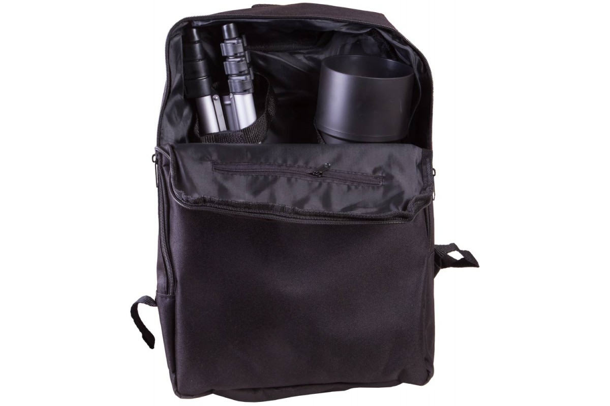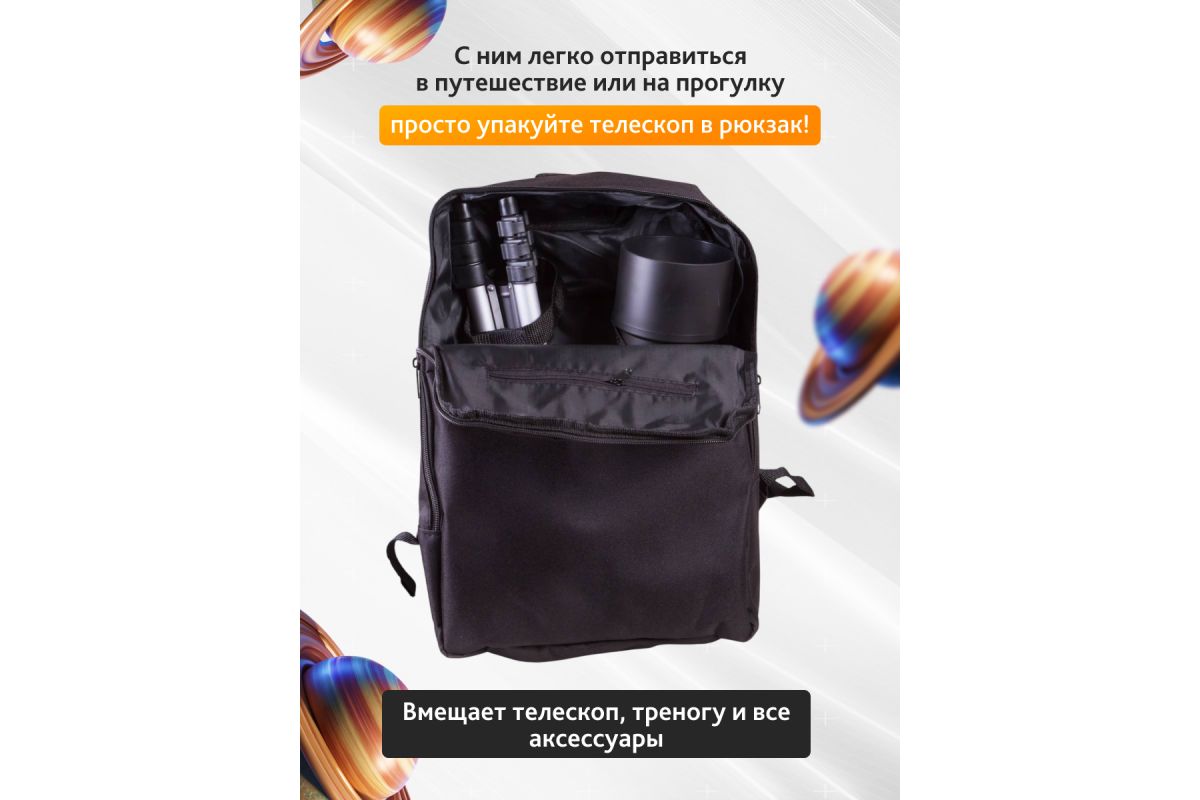 Особенность модели – фирменный рюкзак для упаковки телескопа. В него легко поместятся все детали и аксессуары, а собрать прибор можно за считаные минуты. Телескоп не требует настройки, несложен в управлении, все необходимые аксессуары включены в комплект – можно приступать к наблюдениям сразу после покупки.