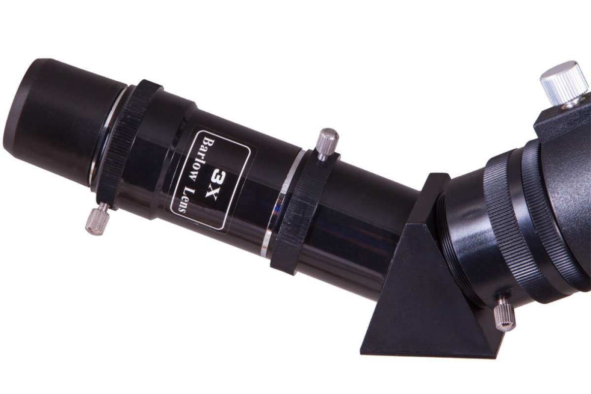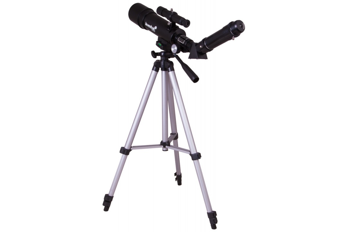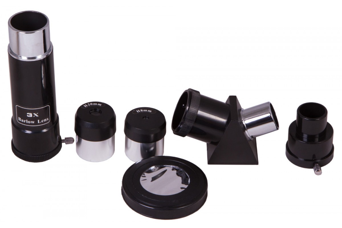 Апертура телескопа – 50 мм, на линзы нанесено полное многослойное просветляющее покрытие. Штатная диагональная призма строит прямое (неперевернутое) изображение, поэтому телескоп вполне может заменить зрительную трубу. Оптический прибор комплектуется всеми необходимыми аксессуарами: двумя окулярами 18x и 45x, линзой Барлоу 3x, диагональной призмой и безопасным солнечным фильтром. В комплекте также идет оптический искатель 2x. Максимальное полезное увеличение телескопа составляет 100x.