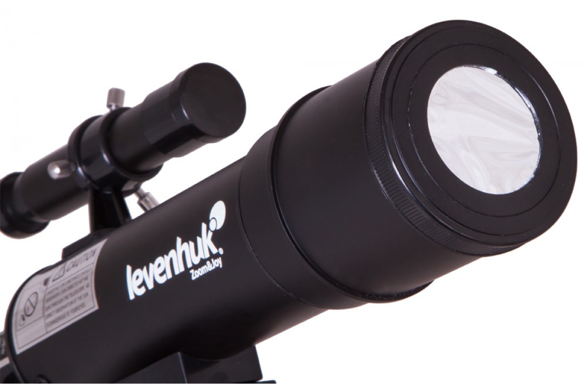 Кроме того, Levenhuk Skyline Travel Sun 50 – это портативный солнечный телескоп. Прибор снабжен фирменным солнечным фильтром из плотной защитной пленки. Фильтр совершенно необходим для наблюдений за Солнцем, без него нельзя смотреть на поверхность звезды и даже на яркую область неба вокруг нее. При наблюдении Солнца оптический искатель лучше закрыть крышкой или даже снять его, чтобы случайно не навредить зрению.