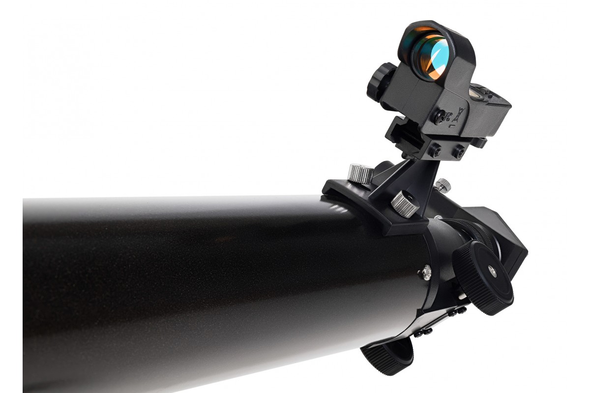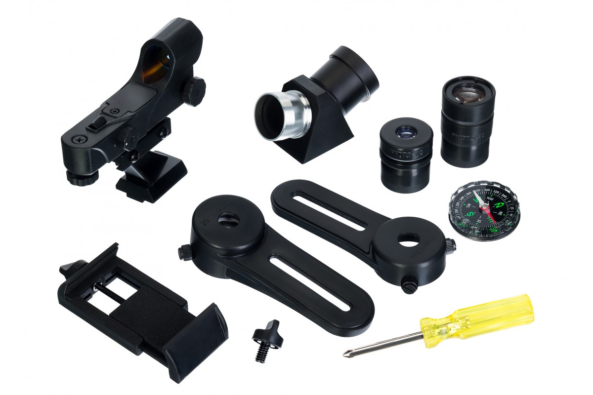 Максимальное полезное увеличение Sky-Watcher 709AZ-GO2 SynScan GOTO составляет 140х. В комплект поставки входят два окуляра PHOTO: с фокусным расстоянием 10 мм для обеспечения кратности 90х и 20 мм для 45х. Первый окуляр подходит для более подробного изучения конкретных космических объектов, а второй – для обзорных наблюдений за просторами космоса. Также вместе с телескопом поставляются: диагональное зеркало 90° с посадочным диаметром 1,25", искатель с красной точкой (Red Dot) и адаптер для смартфона – с этим аксессуаром пользователь сможет снимать любительские фото и записывать видео во время работы с телескопом.