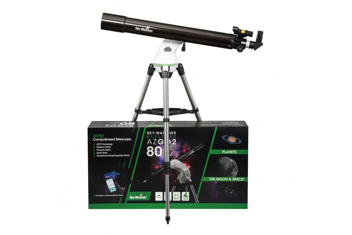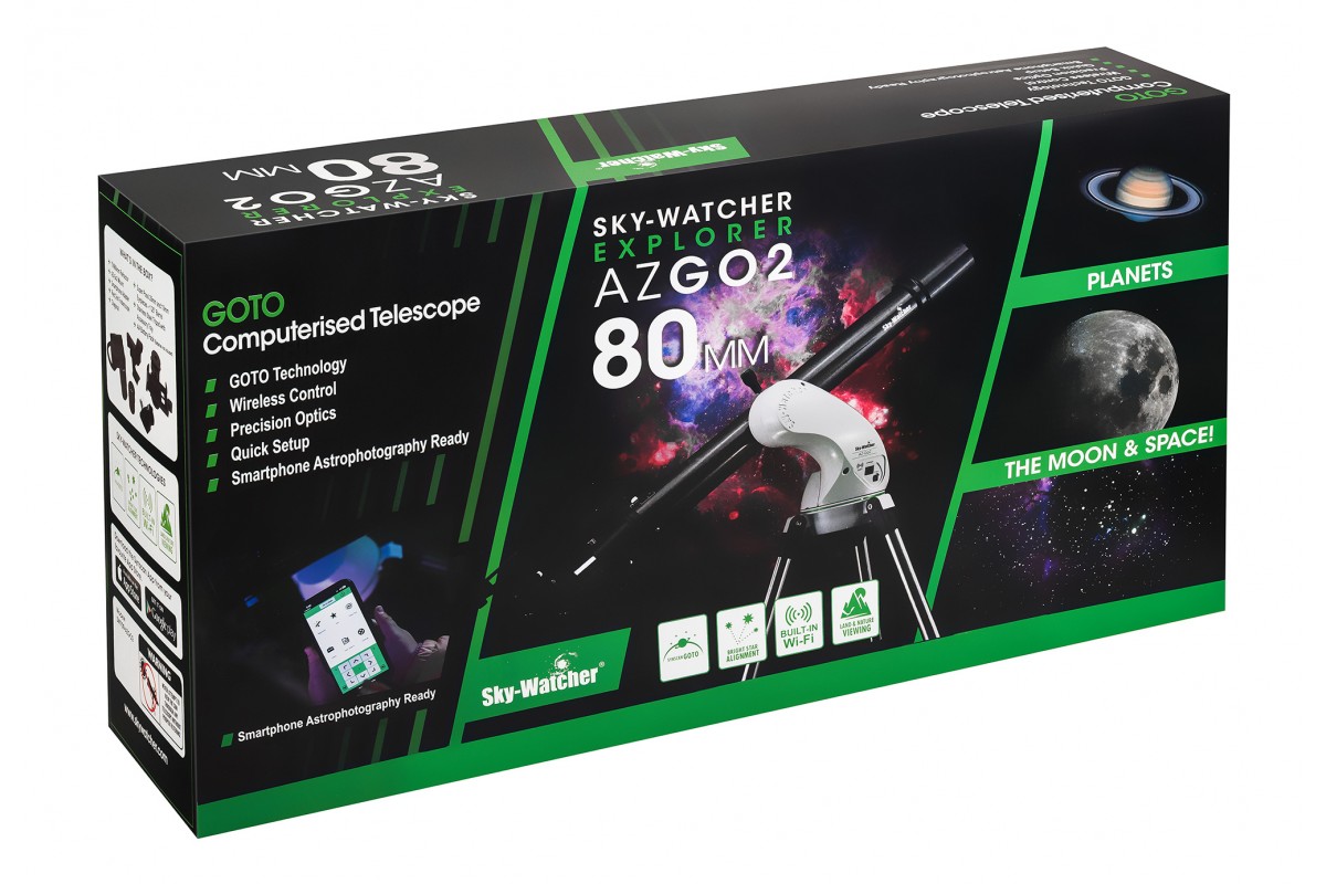 Телескоп Sky-Watcher 809AZ-GO2 SynScan GOTO – это рефрактор-ахромат, дополненный компьютеризованной азимутальной монтировкой AZ-GO2 SynScan GOTO с системой автонаведения, эффективную работу с которой могут вести как новички, так и профессионалы. В комплект поставки уже входят самые необходимые аксессуары для наблюдений, позволяющие начинать эксплуатацию телескопа из коробки: диагональное зеркало 90°, искатель с красной точкой, два окуляра PHOTO 10 мм и 20 мм и удобный адаптер для смартфона.