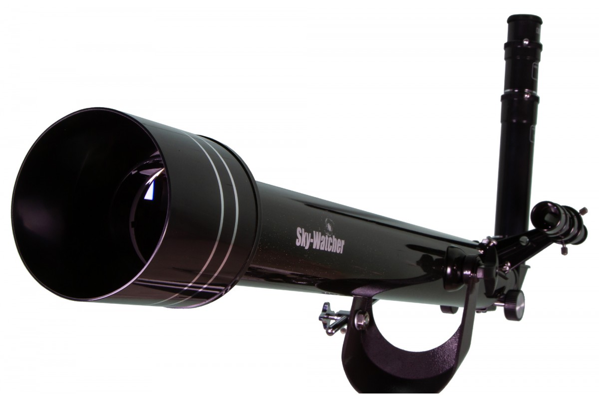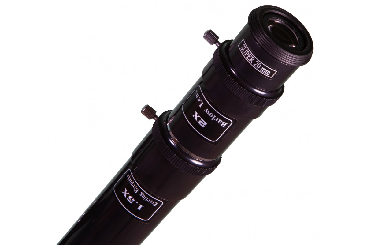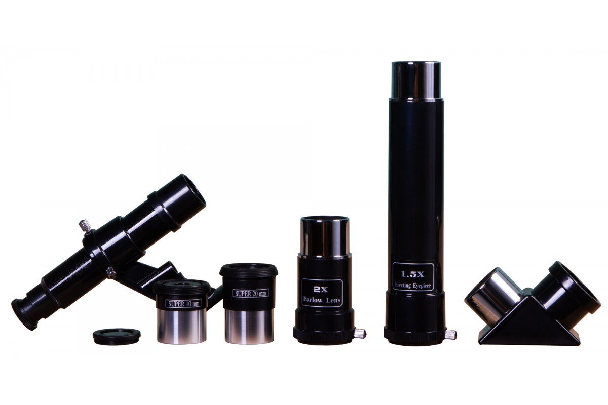 Телескоп собран по схеме рефрактора из ахроматических элементов, поэтому передает четкую и контрастную картинку без цветовых искажений. В комплектацию включено множество аксессуаров, которые позволят приступить к наблюдениям незамедлительно: это окуляры, линза Барлоу, оптический искатель и диагональное зеркало. Дополнительные приобретения не понадобятся.