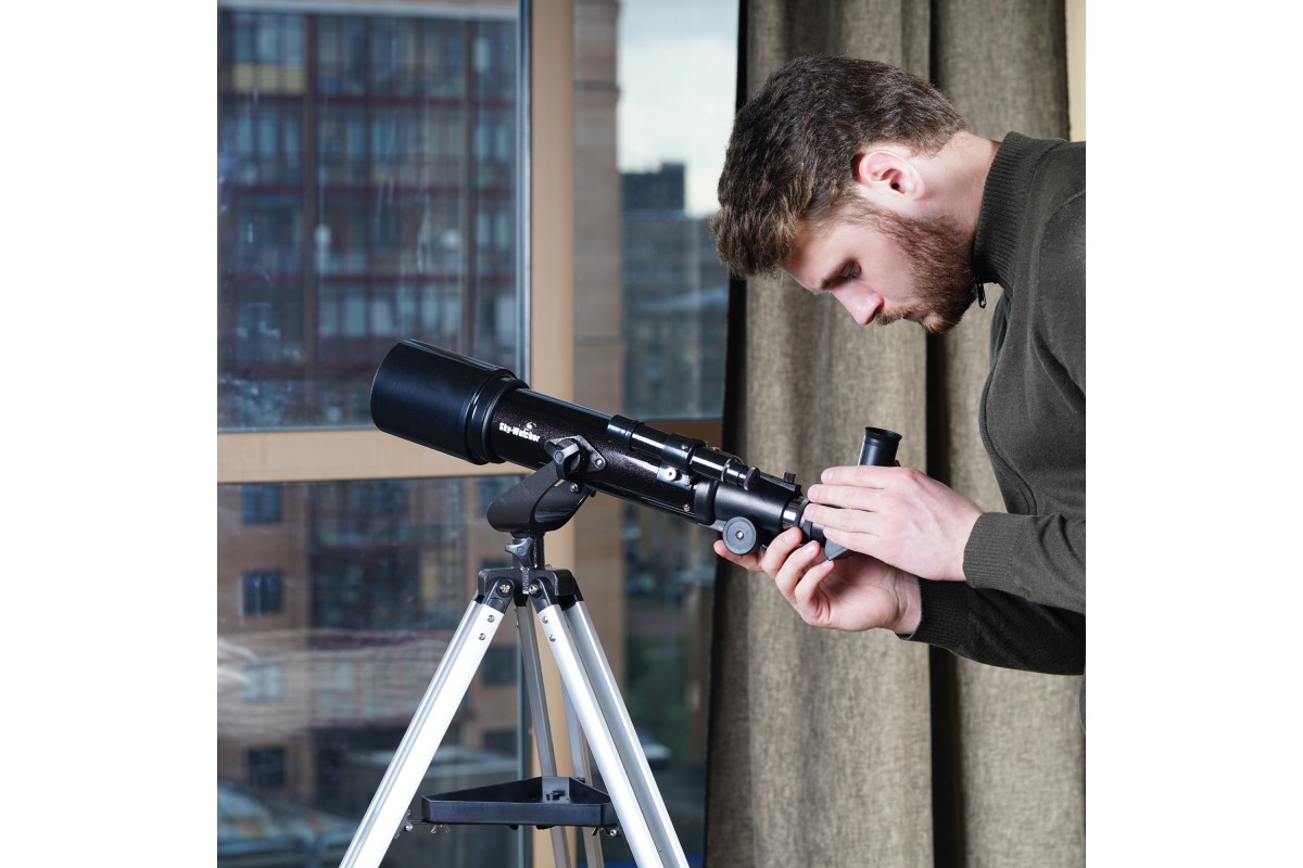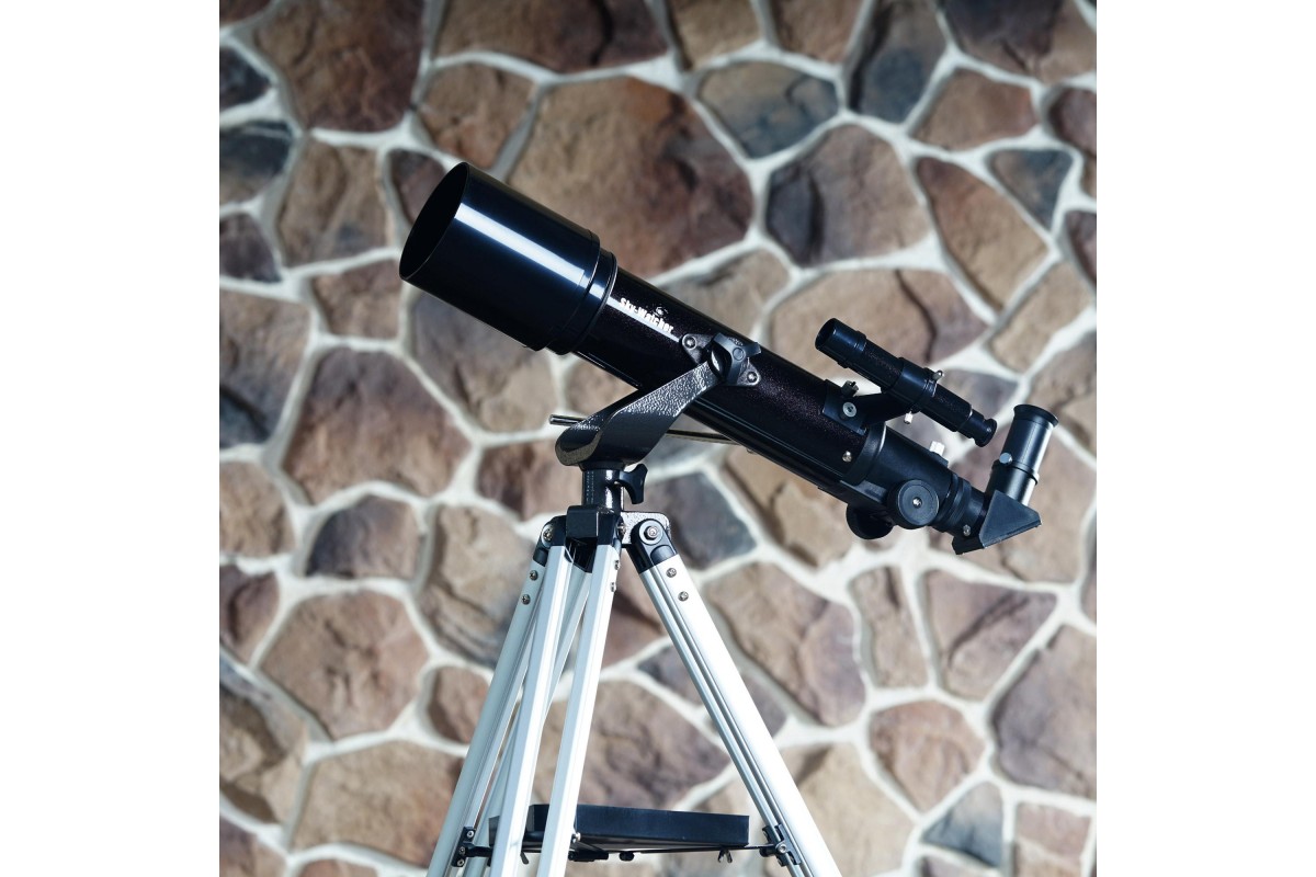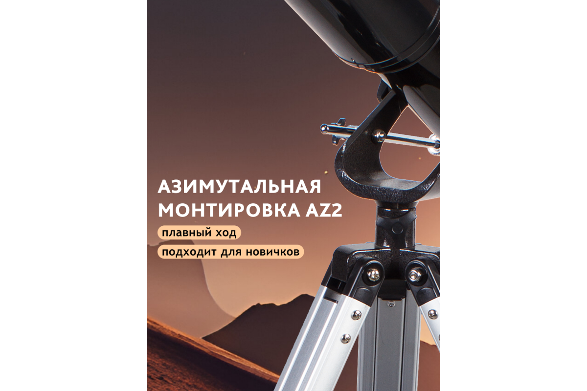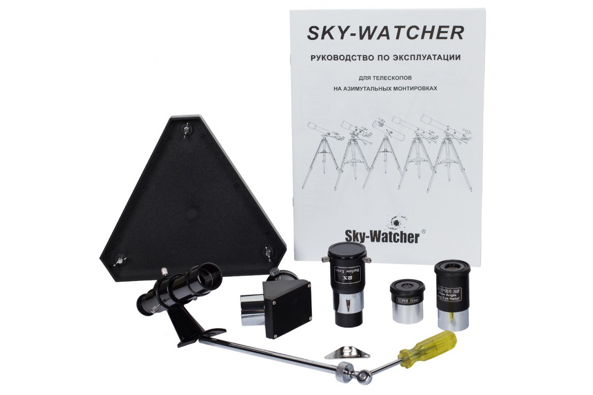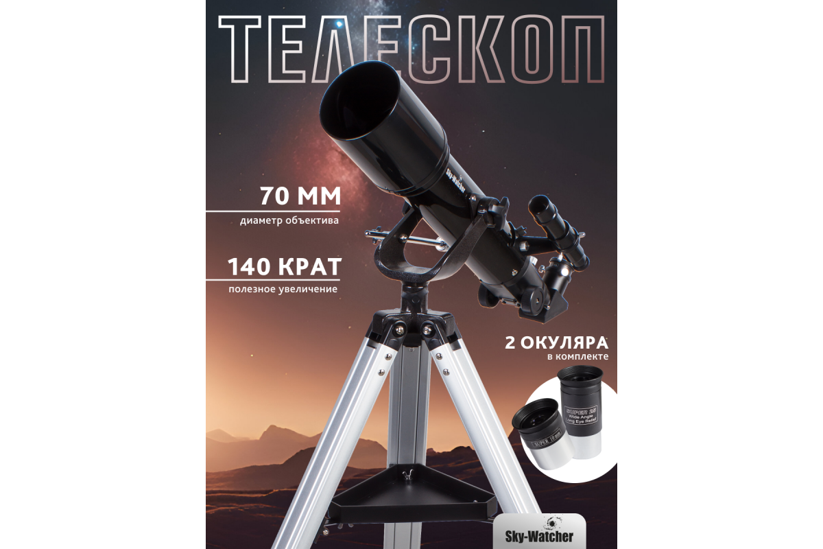 Компактный ахроматический рефрактор Sky-Watcher BK 705AZ2 станет идеальным выбором для начинающих любителей астрономии. Телескоп прекрасно подойдет для наблюдения Луны и планет Солнечной системы. Благодаря небольшим размерам телескоп удобно брать с собой для загородных наблюдений. Ахроматический объектив диаметром 70 мм обеспечивает передачу четкого и резкого изображения с минимальными искажениями. Многослойное просветляющее покрытие линз повышает качество картинки. Для поиска объектов используется оптический искатель 6x24. Данная модель комплектуется окулярами 10 мм и 25 мм, дающими увеличение 50 и 20 крат. Труба устанавливается на азимутальную монтировку. Алюминиевая тренога обеспечивает стабильное положение конструкции. Высоту треноги можно регулировать. Комплект поставки: