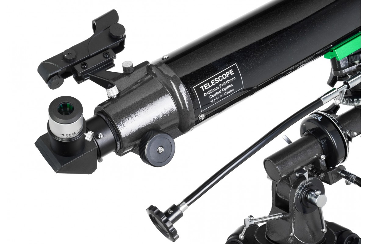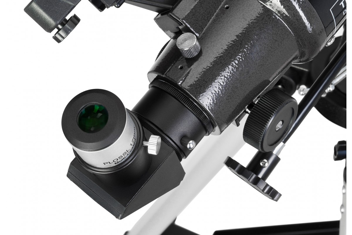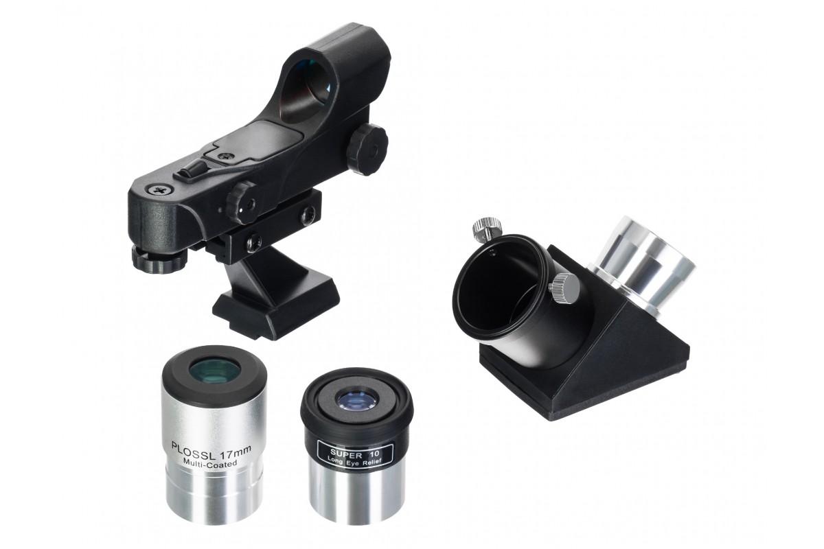 Оптика просветлена и эффективно убирает цветовые искажения из изображения. В базовой комплектации доступны два увеличения – 52х и 90х. Оба достигаются при помощи двух комплектных окуляров. При необходимости на телескоп можно установить дополнительные окуляры или линзу Барлоу для расширения его оптических возможностей. Посадочный диаметр – 1,25 дюйма. Для наземных наблюдений в комплекте есть диагональное зеркало.