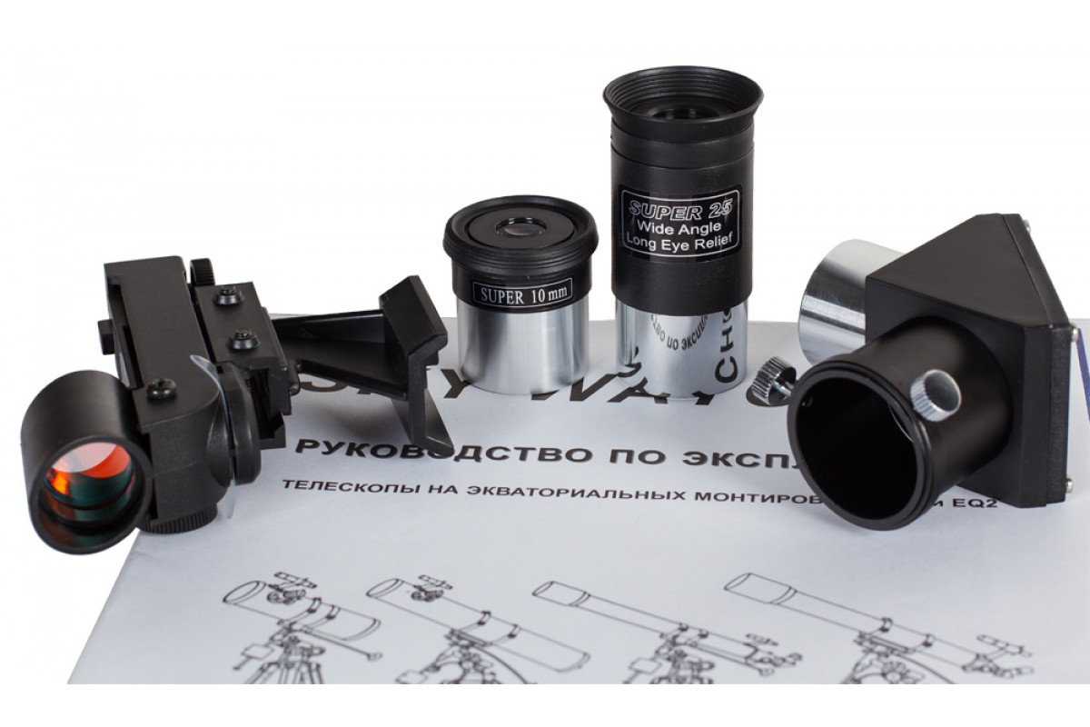 Труба собрана по схеме Максутова-Кассегрена, поэтому при высоких оптических характеристиках телескоп достаточно компактен. В комплект входят два окуляра. Начинать наблюдения рекомендуется с окуляра с большим фокусным расстоянием.