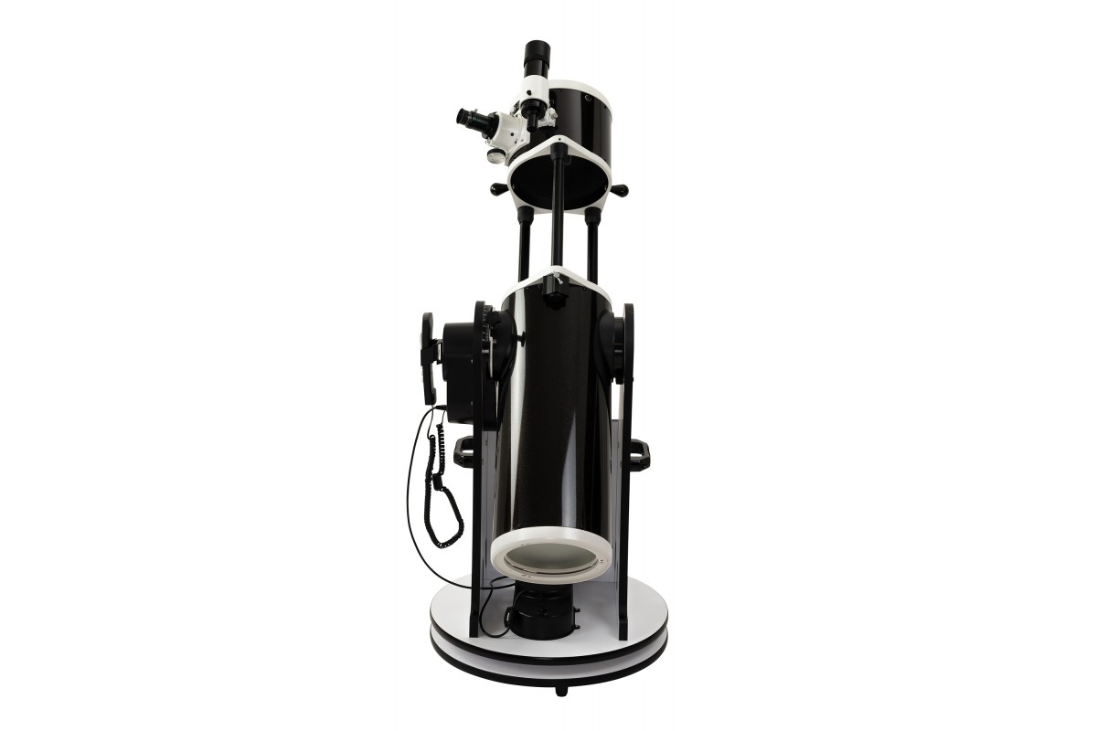 Монтировка Добсона ставится на землю без треноги или штатива. Монтировка обеспечивает максимально устойчивое положение телескопа и гасит все возможные вибрации, поэтому при перемещении оптической трубы картинка не дрожит. Моторные приводы по обеим осям гарантируют плавный ход трубы.
