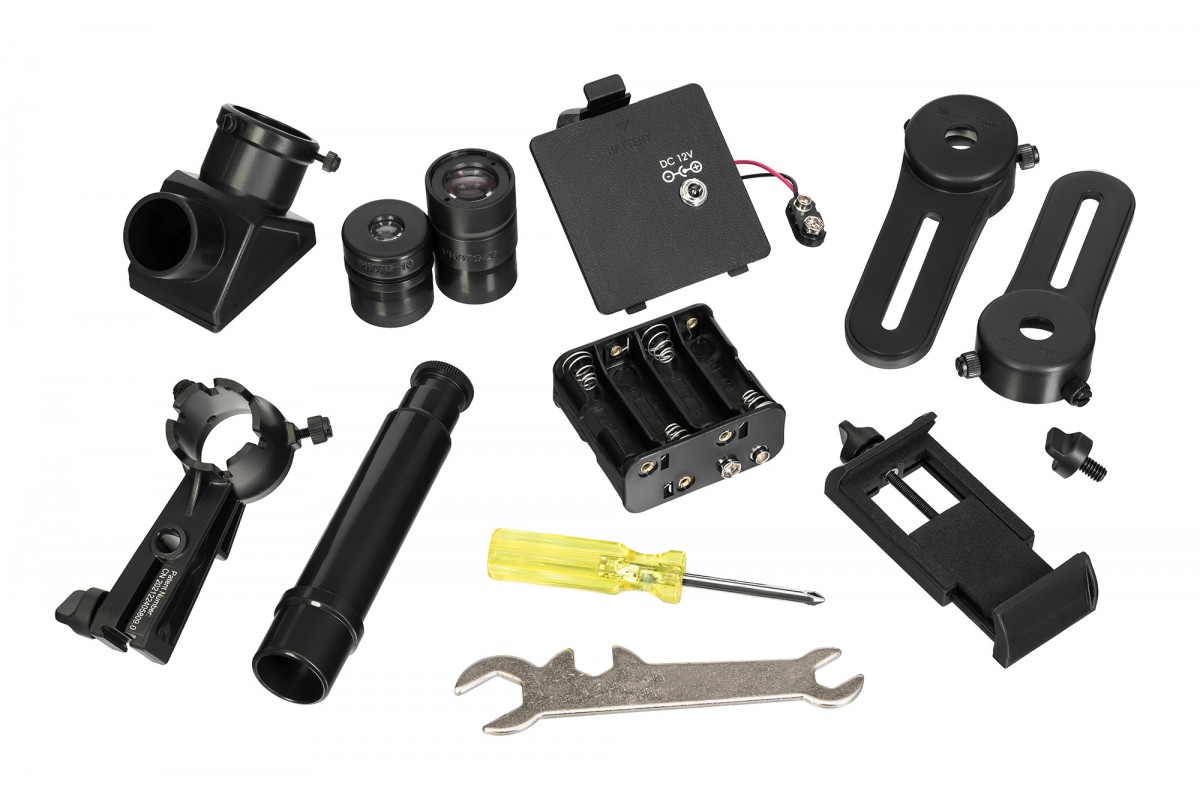 · Аксессуары в комплекте: окуляры, диагональное зеркало, оптический искатель, адаптер для смартфона, тренога