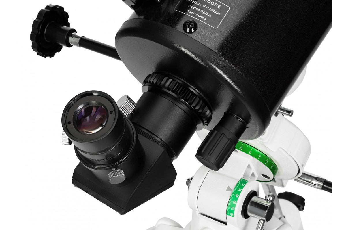 В комплекте с телескопом Sky-Watcher MAK102 StarQuest2 EQ2 поставляется набор начальных аксессуаров: 2 окуляра – 10 и 20 мм, диагональное зеркало 90°, искатель с красной точкой, противовес, а также штатив. Стальной штатив-тренога создает прочную и надежную базу для установки конструкции (монтировка + телескоп + аксессуары), с которой предполагается ведение наблюдений за звездным небом. Ножки штатива регулируются по высоте. Между опор можно разместить лоток для аксессуаров.