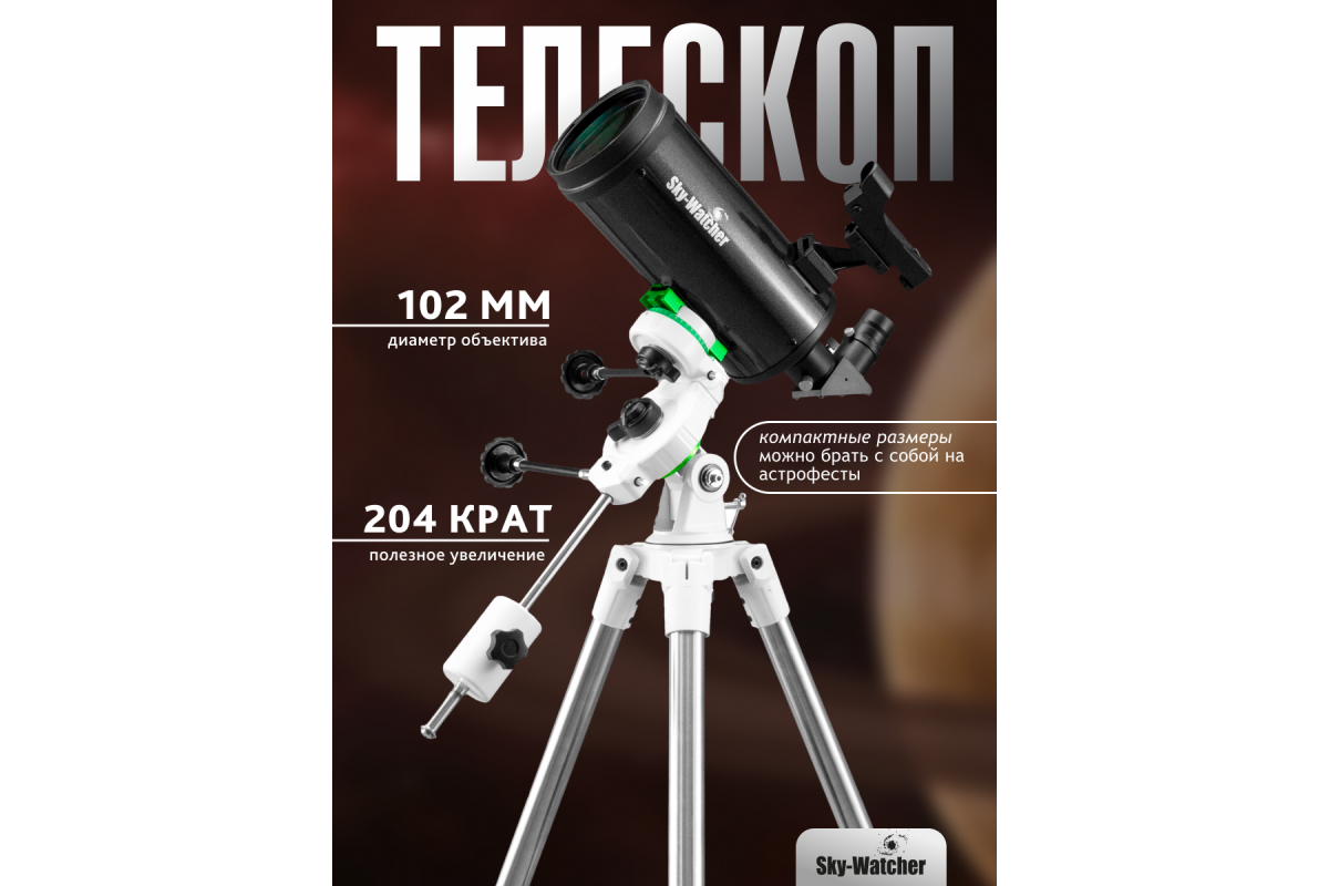 Зеркально-линзовый телескоп Sky-Watcher MAK102 StarQuest2 EQ2, построенный по схеме Максутова-Кассегрена, предназначен для обзорных астрономических наблюдений и подробного изучения далеких космических объектов: туманностей, планет, звезд и т. д. Укороченный корпус компактных размеров, закрытая конструкция, защищенная от пыли и воздушных потоков, достойные оптические свойства и возможности наблюдения – все это делает Sky-Watcher MAK102 StarQuest2 EQ2 отличным выбором для регулярного использования в астрономической работе. Апертура 102 мм и фокусное расстояние 1300 мм, которые в совокупности с входящими в комплект окулярами дают максимально полезное увеличение 204 крата, позволят пользователю наблюдать все объекты из каталога Мессье и наиболее яркие небесные тела из каталога NGC, планетарные и диффузные туманности, лунные кратеры (размером не менее 5 км), щель Кассини в кольцах Сатурна, фазы Меркурия, полярные шапки на Марсе и многое другое.
