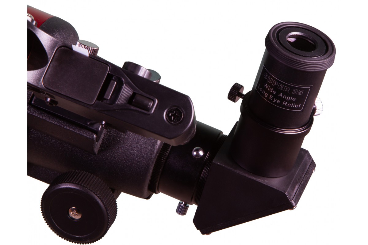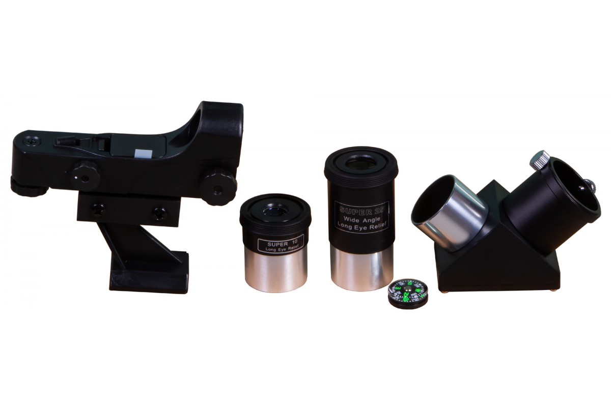 Ахроматическая оптика эффективно борется с цветовыми искажениями, позволяя видеть мелкие детали более четко и ясно. Телескоп отлично справляется с передачей картинки ближнего космоса, хорошо подходит для наблюдений за наземными объектами и может использоваться для исследования дальних уголков Вселенной. В комплект поставки включены необходимые аксессуары: два окуляра, диагональное зеркало и искатель с красной точкой.