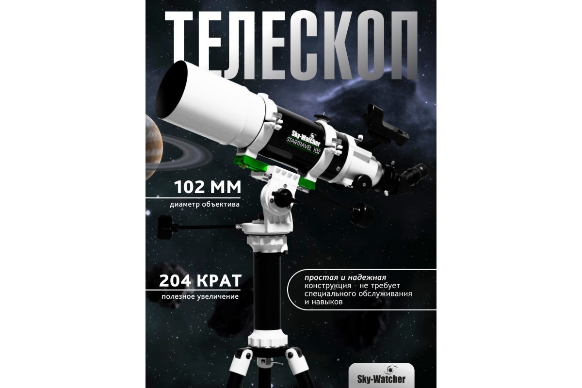 Телескоп Sky-Watcher StarTravel BK 102 AZ PRONTO – это рефрактор-ахромат, используемый для обзорных астрономических наблюдений, астрофотографии и подробного изучения планет, звезд, галактик и туманностей. Его оптических возможностей достаточно для рассматривания гор и кратеров на Луне, облачных поясов на Сатурне, астероидов и комет, спиральных структур самых ярких галактик, объектов из каталога NGC, звездных скоплений, двойных звезд и так далее. Изображение, получаемое с телескопа, всегда остается четким, контрастным и ясным, так как ахроматический объектив предотвращает возникновение хроматических аберраций, а многослойное просветляющее покрытие на линзах дополнительно корректирует визуальные свойства картинки. Телескоп-рефрактор подходит для использования как опытными, так и начинающими пользователями. Конструкция прибора имеет простое и надежное устройство, не требующее специального дорогостоящего обслуживания.