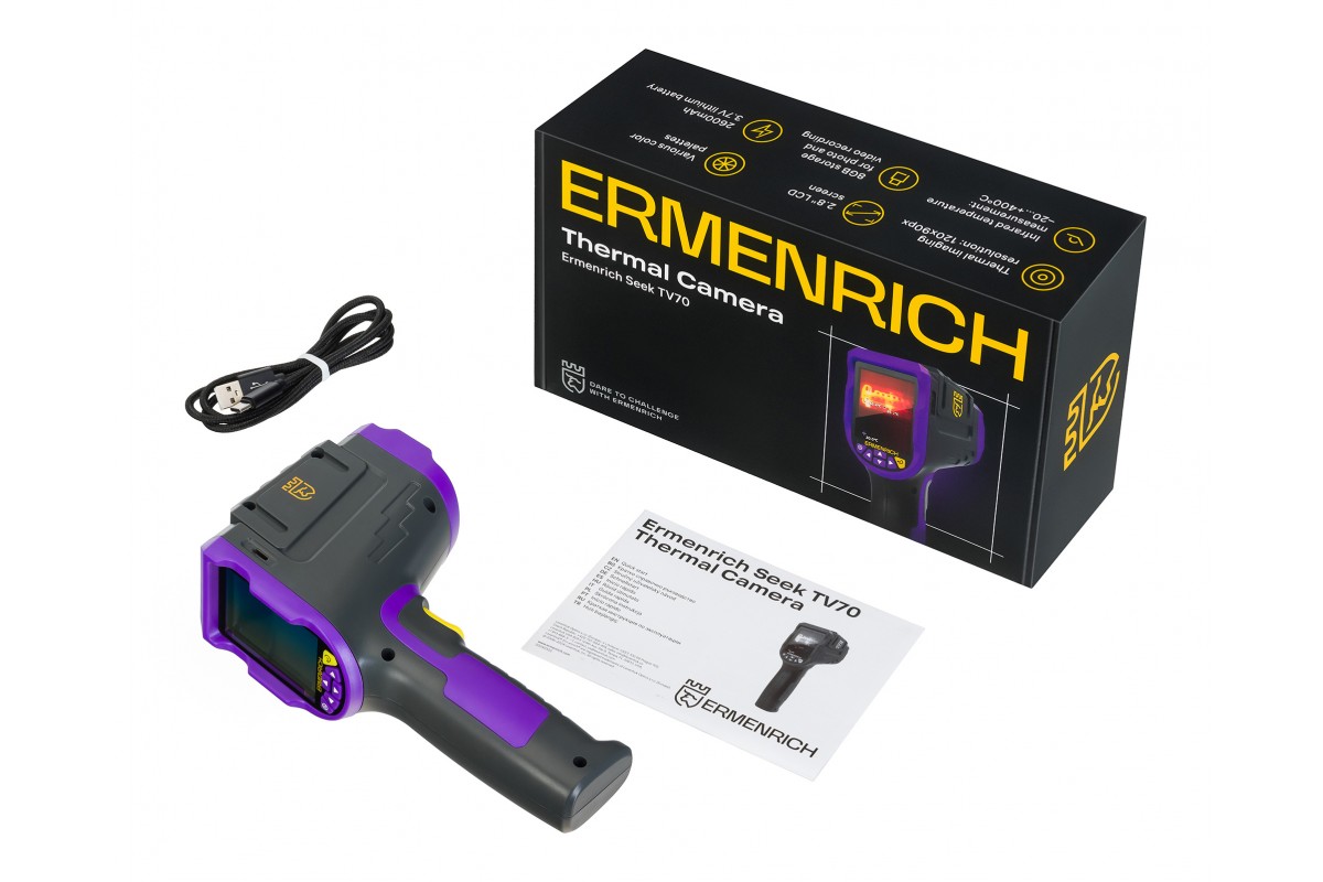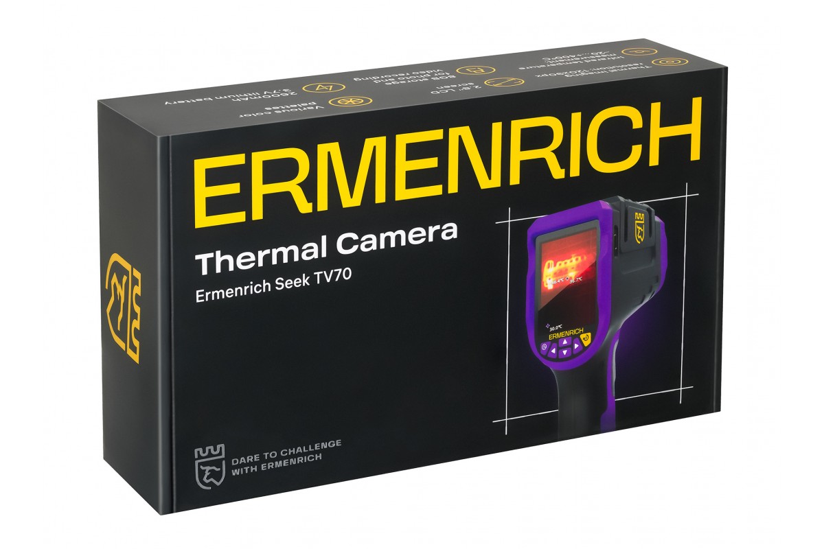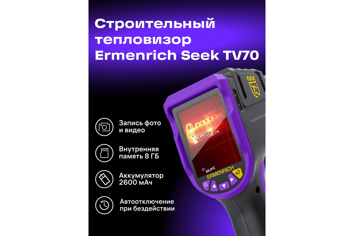 Ermenrich Seek TV70 – строительный тепловизор для обследования электрического и теплового оборудования, поиска неисправностей, утечек тепла в фасадах и фундаментах зданий. Главный элемент прибора – тепловизорный модуль 120x90 пикс с камерой 1 Мпикс, что позволяет считывать изменения температуры в диапазоне от –20 до +400 °С.