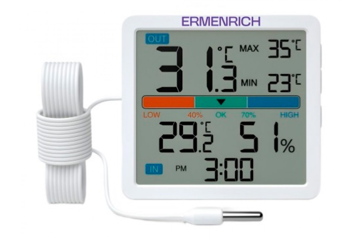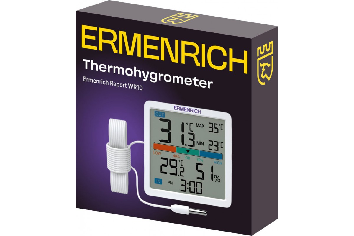 Термогигрометр Ermenrich Report WR10 оснащен наружным зондом с кабелем длиной 1,4 м для считывания информации об атмосфере на удалении. Вне зависимости от места проведения измерений, устройство сохраняет высокую точность: так, в помещении оно определяет температуру в диапазоне от 0 до +50 °C, а за его пределами – от –40 до +70 °C с погрешностью всего ±2 °C. Влажность измеряется в диапазоне от 20 до 95%, при этом в обычных условиях без аномальных дождей и туманов прибор не ошибется более чем на ±5–10%. Термогигрометр имеет программный алгоритм, рассчитывающий уровень комфорта погоды на основе значений влажности – результат отображается на экране в виде наглядной цветной полосы. Он также может сохранять максимальные и минимальные зарегистрированные значения, которыми позднее можно воспользоваться для любительской оценки погодных тенденций.