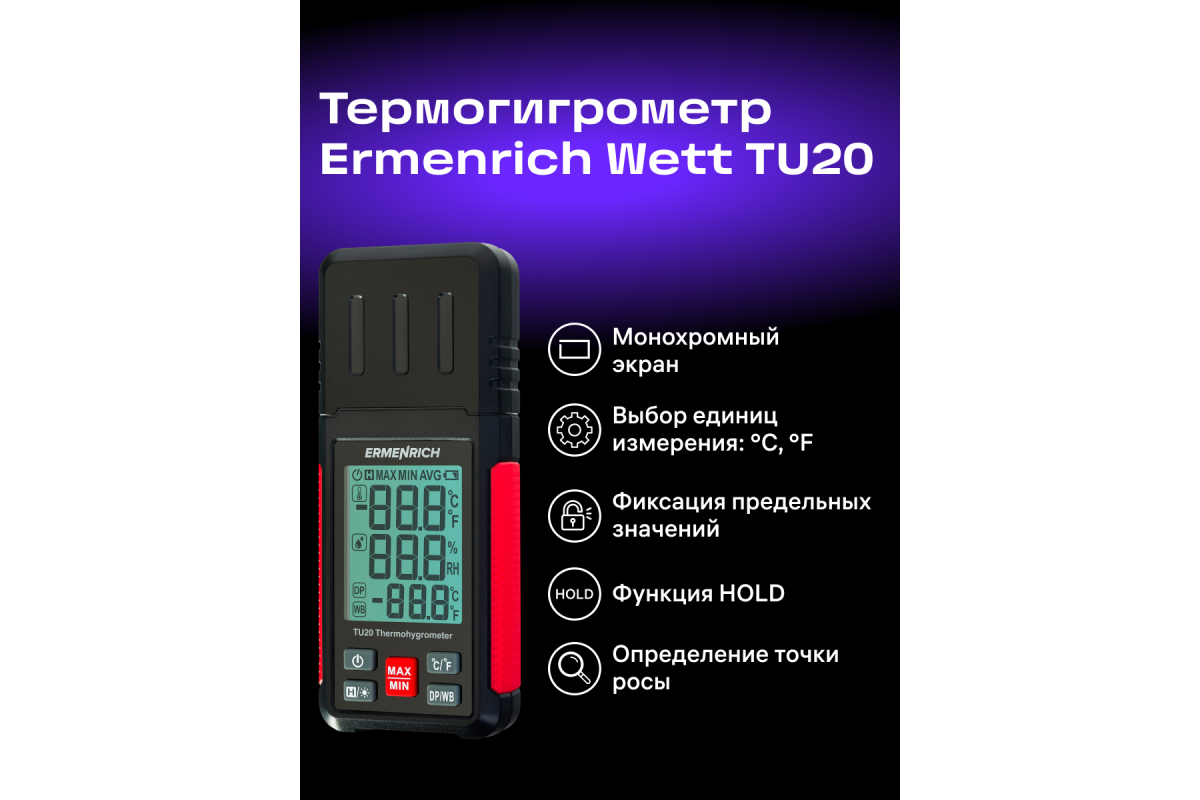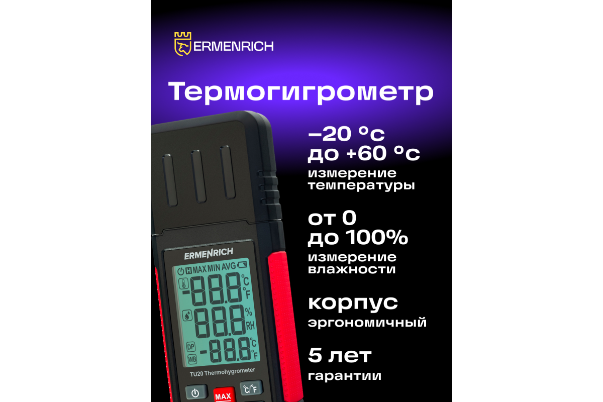 Термогигрометр Ermenrich Wett TU20 удобно использовать как в быту, так и в офисе, на складе или на производстве – он имеет компактный, эргономичный корпус и работает автономно. Возможность оперативно отслеживать температуру и влажность в помещении или на улице помогает создавать комфортный микроклимат.