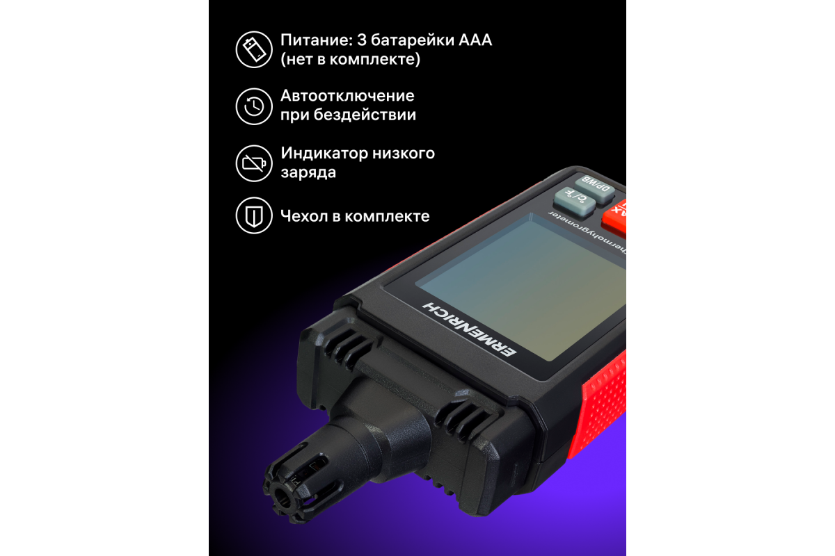 На черно-белом дисплее отображаются данные о температуре в градусах по Цельсию или Фаренгейту (от –20 до +60 °C), влажность в процентах (от 0 до 100), а также минимальные и максимальные значения предыдущих замеров. Присутствует функция удержания показаний.