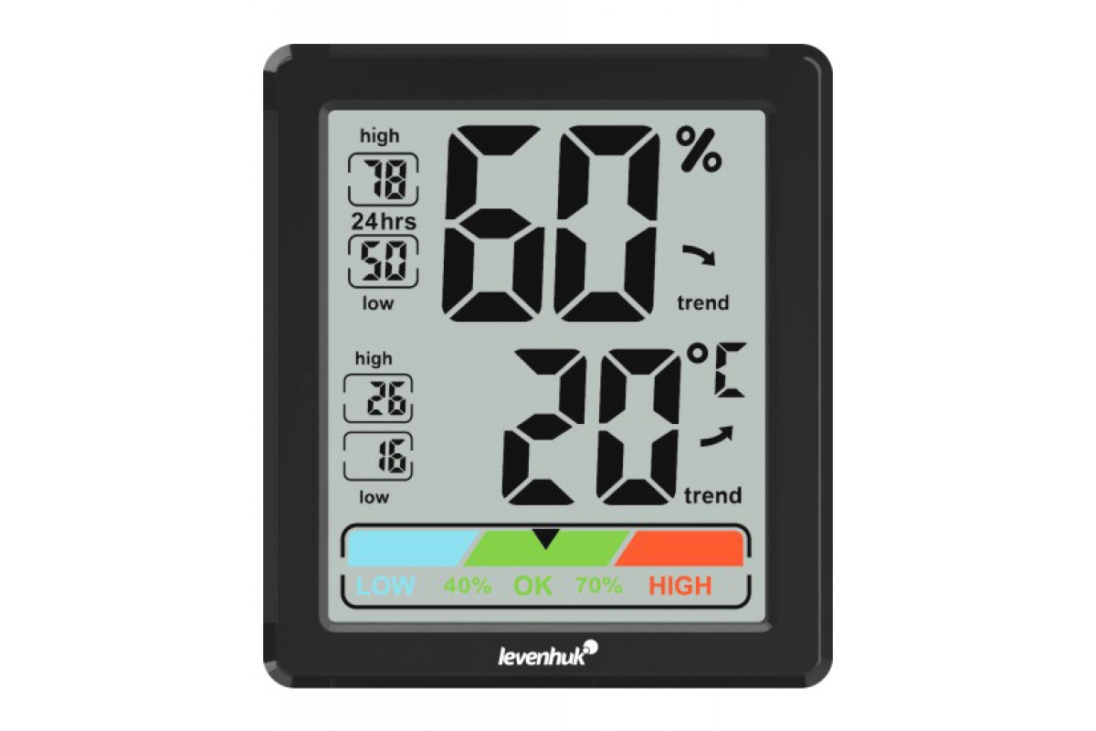 В верхней части экрана термогигрометра Levenhuk Wezzer BASE L20 демонстрируется влажность воздуха, ниже – информация о температуре. Рядом с цифрами располагаются стрелки-индикаторы, указывающие на повышение или понижение текущего значения. Там же можно увидеть максимумы и минимумы. Внизу экрана есть цветная шкала оценки комфорта в помещении, указатель которой перемещается между зонами «LOW» (низкая влажность до 40%), «OK» (оптимальная влажность 40–70%) и «HIGH» (влажность свыше 70%).
