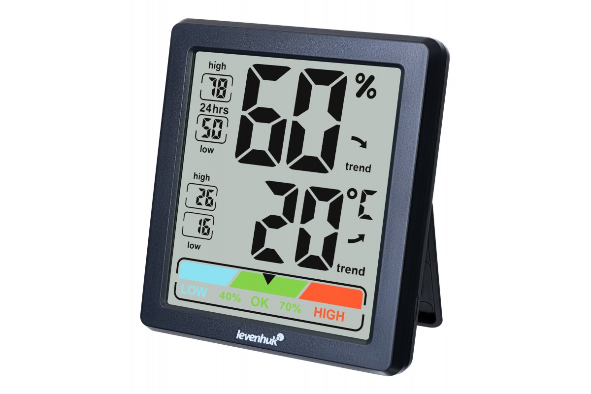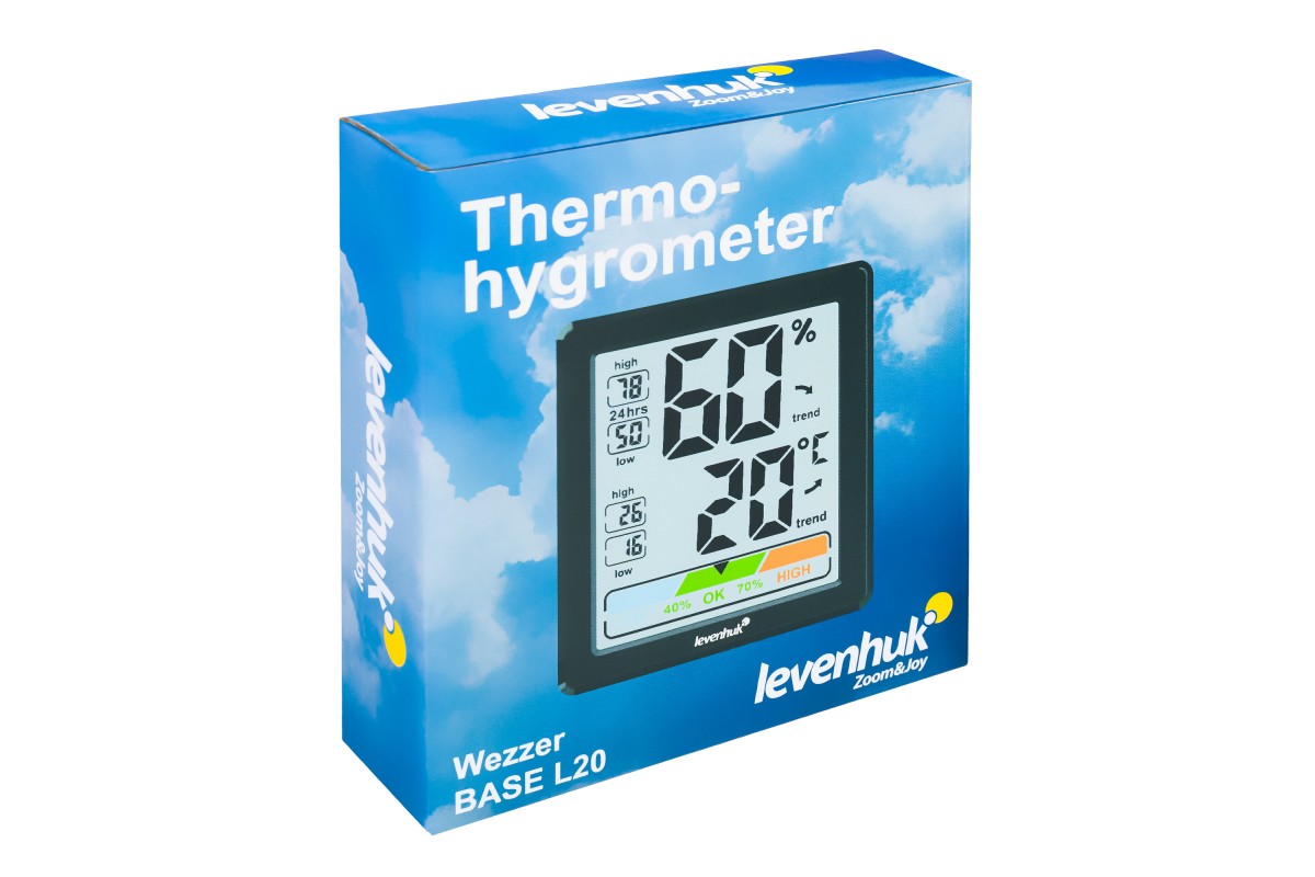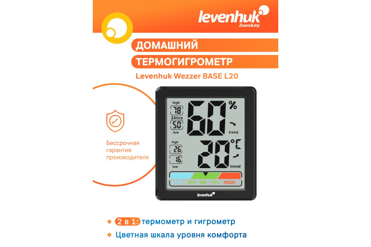 Levenhuk Wezzer BASE L20 – простой в управлении термогигрометр с базовым функционалом. Он измеряет температуру и влажность в помещении, отображая текущие значения, а также наибольшие и наименьшие показания за последние сутки. Кроме того, прибор позволяет отслеживать динамику изменения значений параметров и всегда быть в курсе состояния микроклимата. Модель отлично проявит себя в любом помещении, будь то спальня или детская, офис или дачный дом.