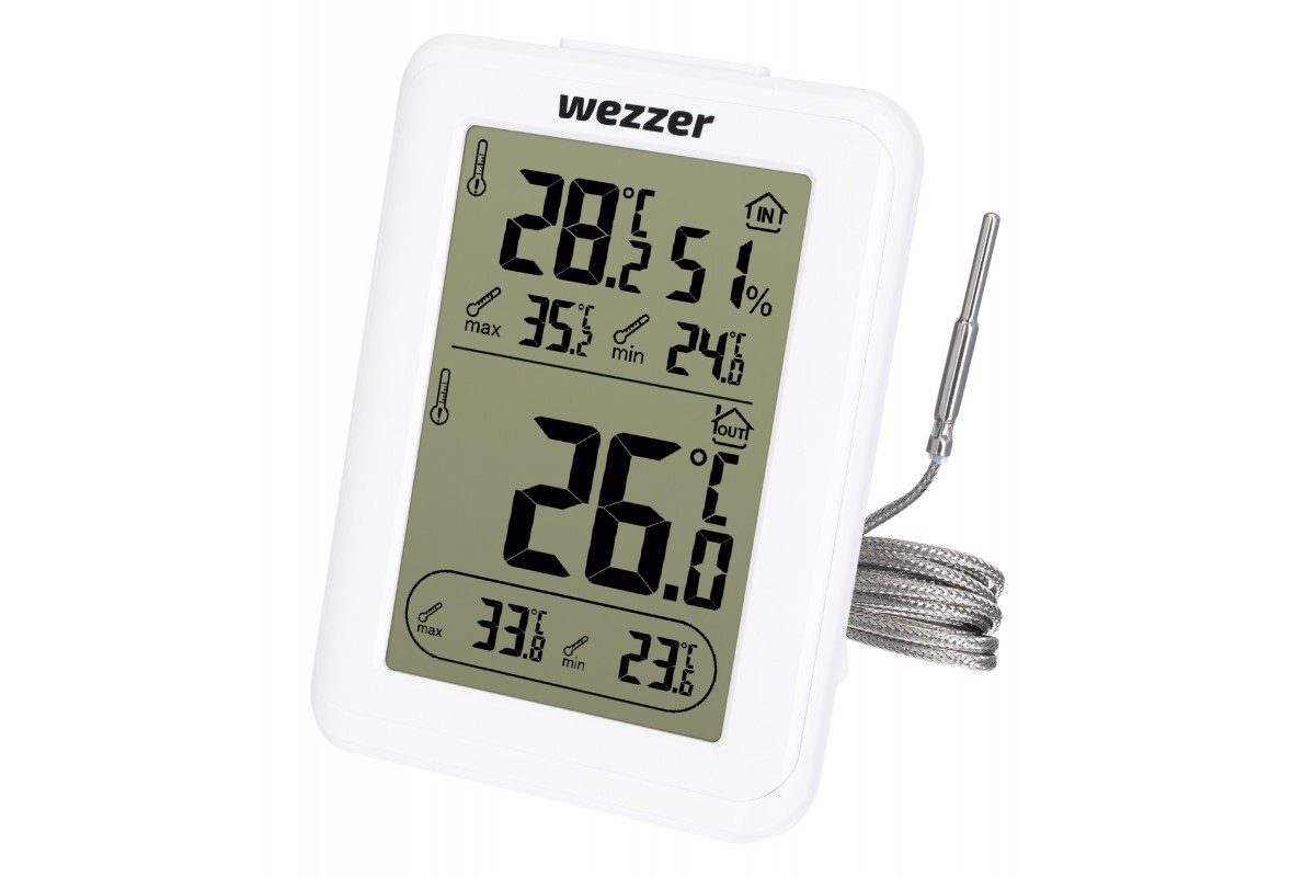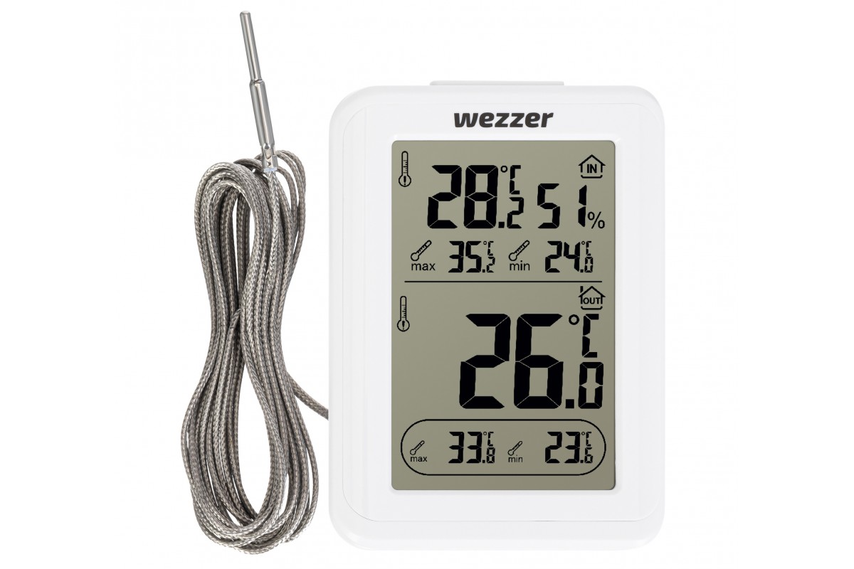 Все измерения выводятся на встроенный экран прибора: с основного блока – в верхнюю его половину, с термощупа – в нижнюю. Для обоих датчиков также проводится определение минимальной и максимальной температуры. Основной блок дополнительно определяет уровень влажности воздуха.