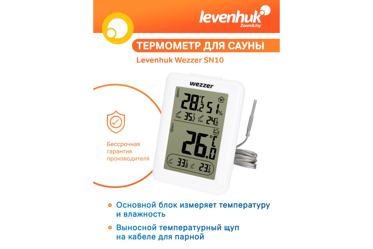 Термометр Levenhuk Wezzer SN10 создан специально для использования в сауне. Чрезвычайно важно поддерживать благоприятный микроклимат в парильном помещении и комнате отдыха, и этот термометр помогает не только подготавливать помещения должным образом, но и контролировать любые негативные тенденции изменения температуры.