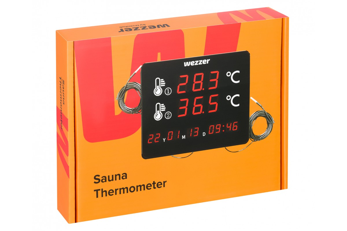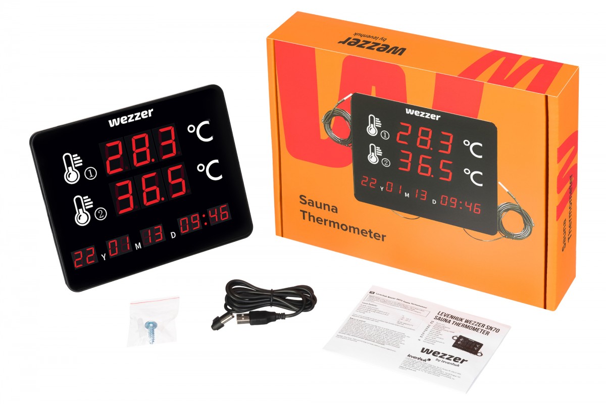 Levenhuk Wezzer SN70 – гаджет для контроля температуры в сауне. Он снабжен двумя выносными термощупами. Каждый из них может проводить измерения в диапазоне от –40 °C до +125 °C и предупреждать о слишком неблагоприятных значениях. Щупы закреплены на гибких кабелях длиной 5 метров, поэтому могут быть установлены на большом удалении от основного модуля. Этот термометр прекрасно подходит для постоянного мониторинга микроклимата помещений сауны, чтобы условия внутри были безопасны и благоприятны.