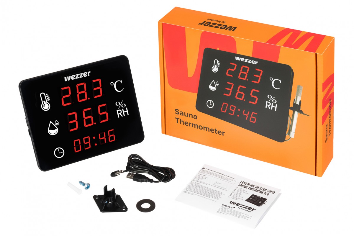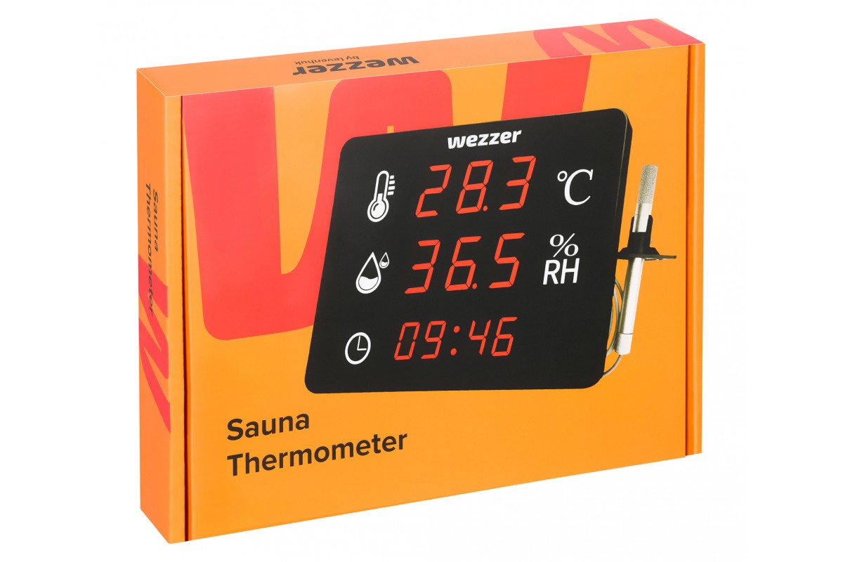 Термометр для сауны Levenhuk Wezzer SN80 интересен тем, что может измерять не только температуру, но и влажность воздуха. Это позволяет контролировать сразу два наиболее важных для самочувствия параметра и легко создавать максимально комфортные условия в парильном помещении. Прибор состоит из основного модуля и выносного щупа на гибком кабеле, измерения проводит только щуп.
