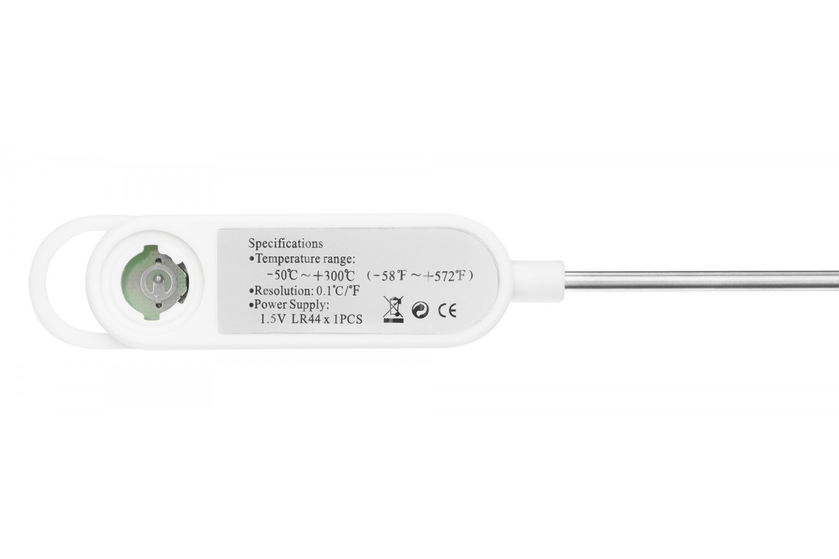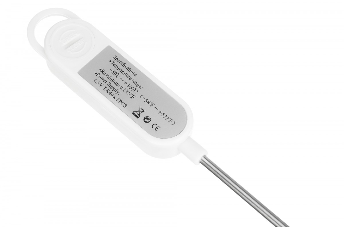 Конструкция прибора проста: к корпусу, на котором расположены экран и кнопки управления, присоединен длинный щуп, измеряющий температуру. Корпус сделан из высокопрочного PC-пластика, щуп – из нержавеющей пищевой стали. На экране отображаются измерения в °C или °F (на выбор пользователя), есть функция фиксации текущей температуры.