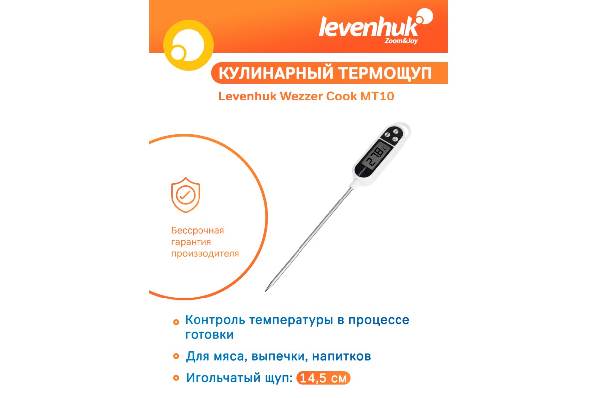 Кулинарный термометр Levenhuk Wezzer Cook MT10 нужен для получения идеальных блюд, которые будут радовать вкусом и ароматом. Незаменим при приготовлении стейков, шашлыков, выпечки и соусов. Крайне полезен при заваривании некоторых сортов чая, которые требуют точного соблюдения температурного режима. Также пригодится для разогревания детского питания и молока. Термощуп Levenhuk Wezzer Cook MT10 – незаменимый помощник на любой кухне.