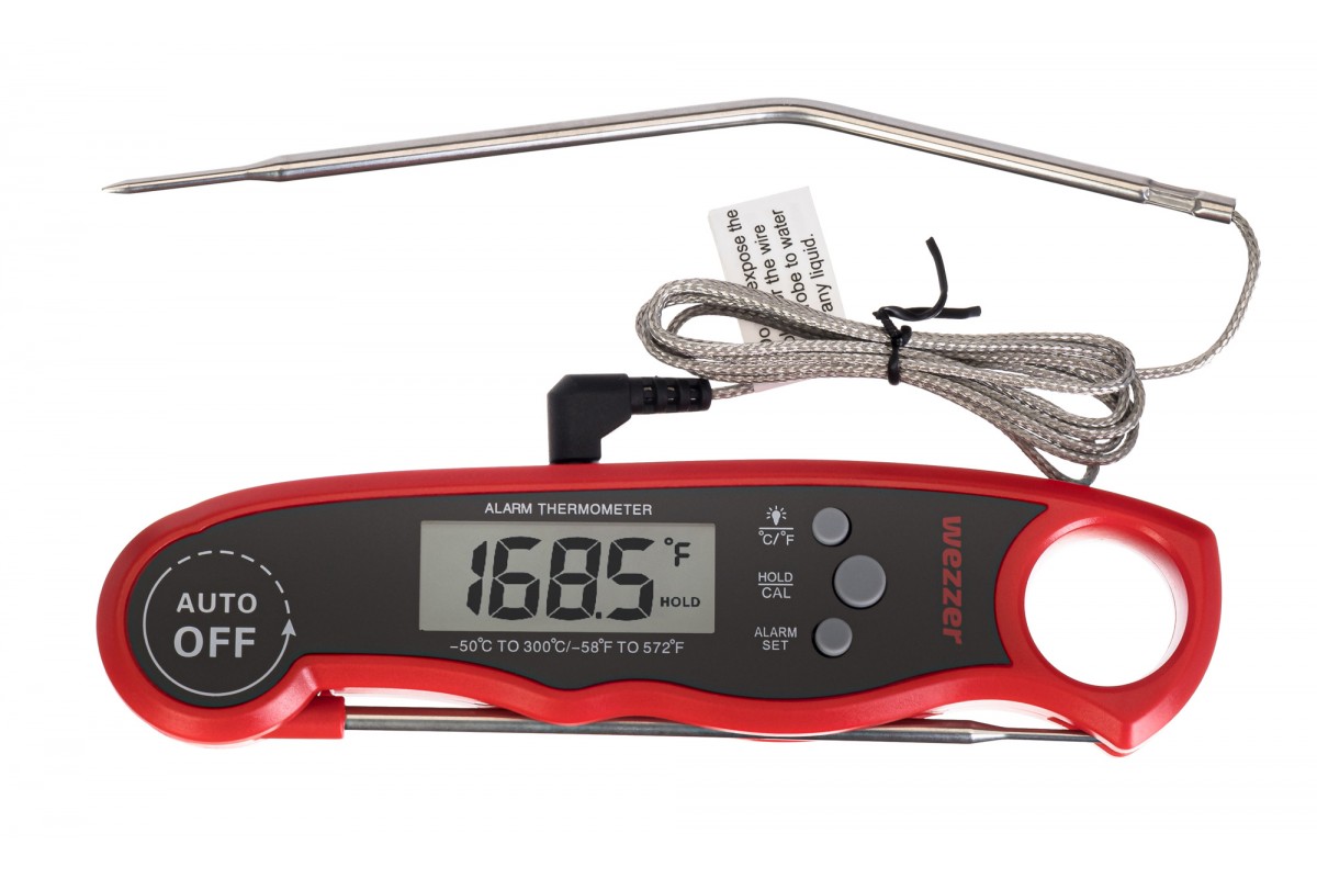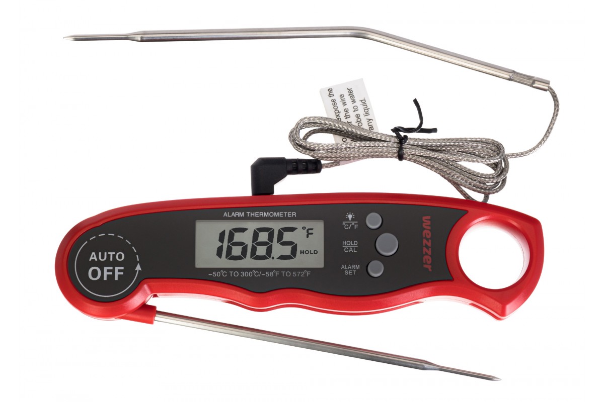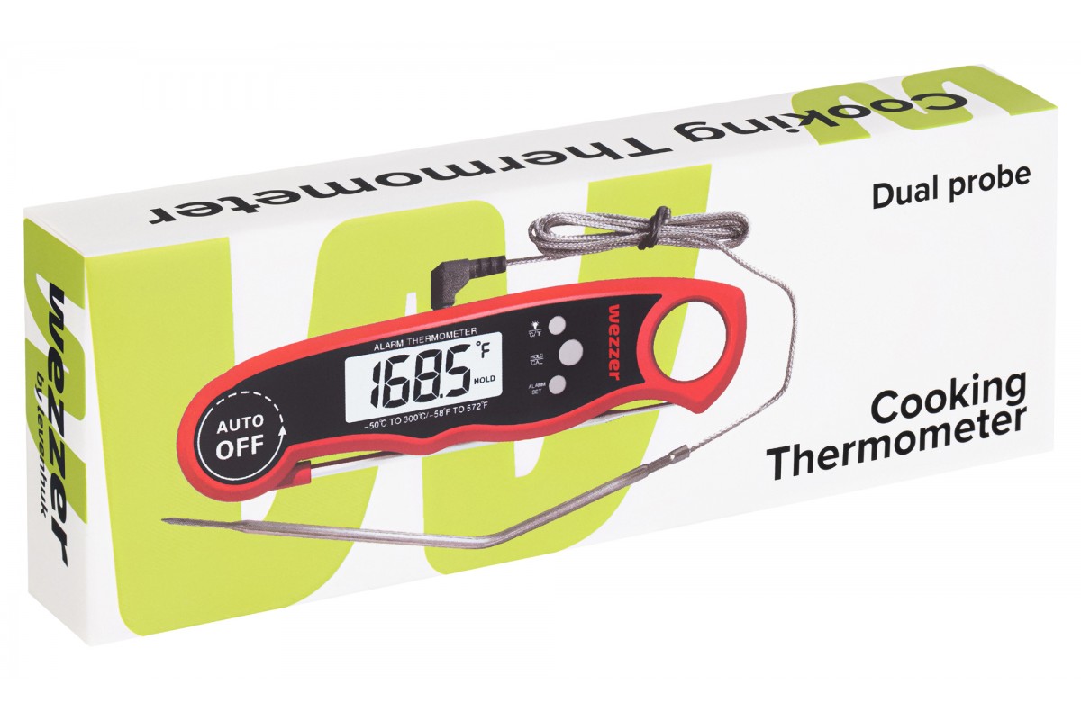Levenhuk Wezzer Cook MT50 – кулинарный термометр с двумя щупами. Он применяется для получения информации о температуре разных блюд: мяса, выпечки, соусов и проч. Один щуп закреплен на гибком кабеле, второй имеет классическую конструкцию. Диапазон измеряемой температуры широкий, есть возможность выбора единиц измерения: градусы Фаренгейта или градусы Цельсия.