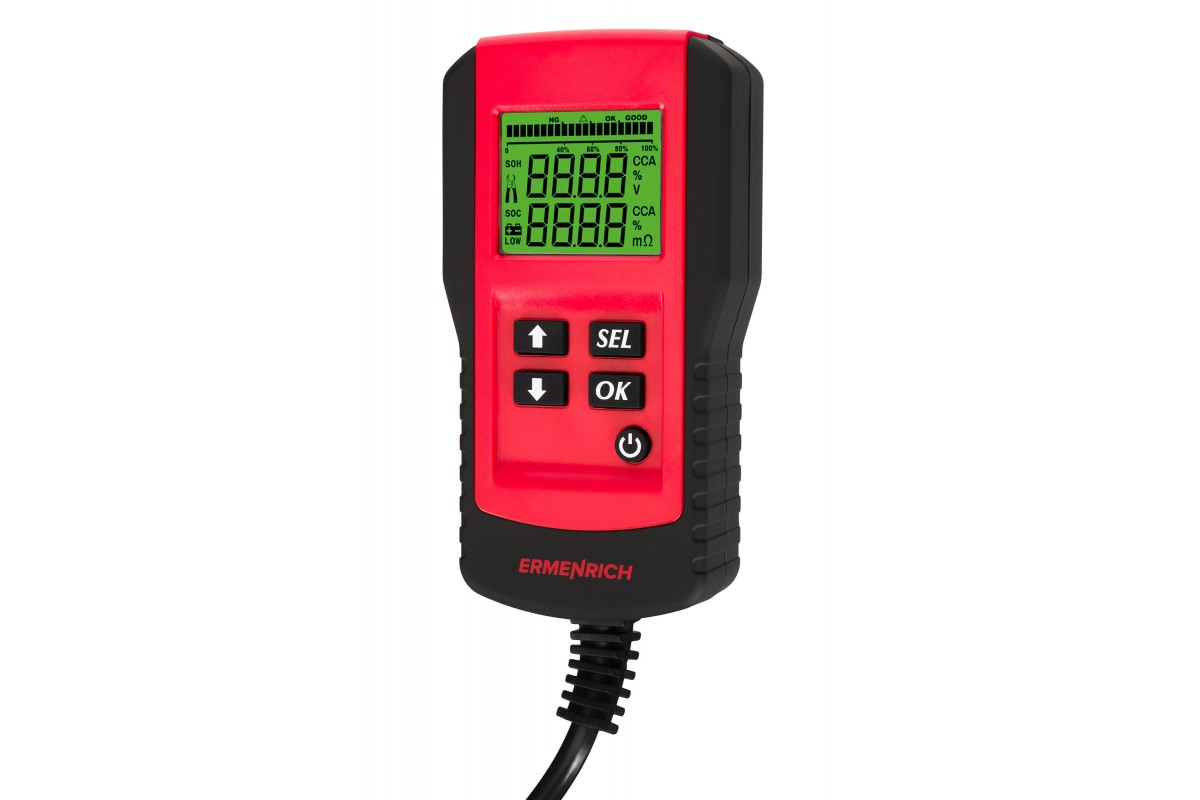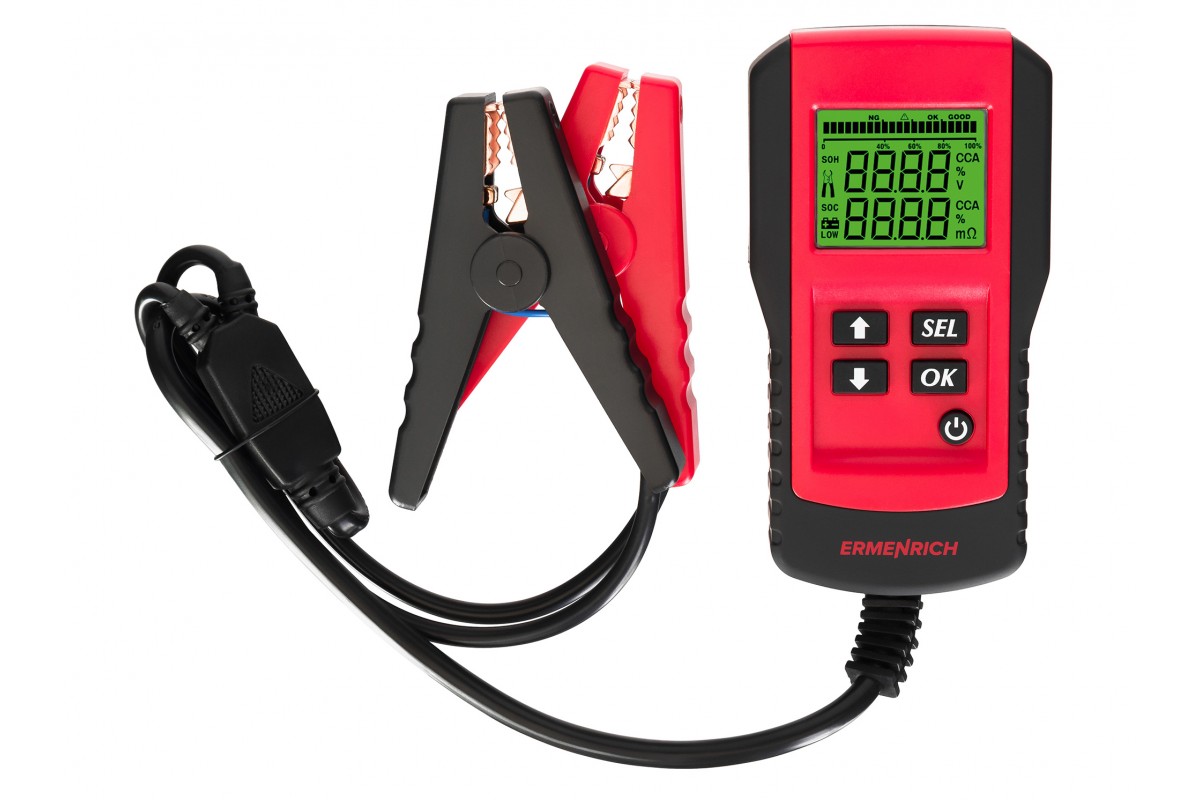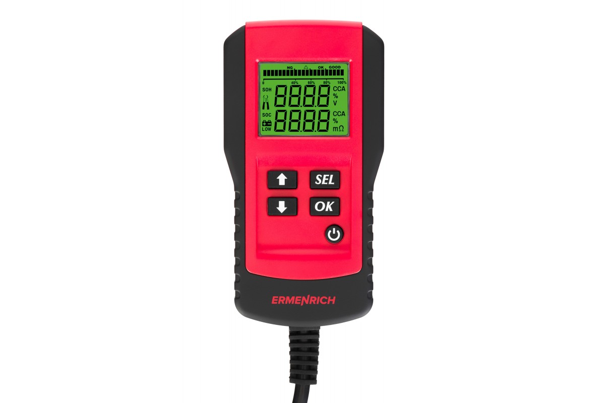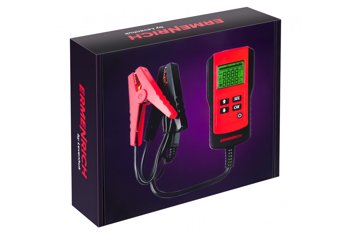Ermenrich Zing AL45 – аккумуляторный тестер, который предназначен для проверки состояния батарей, используемых в автомобилях и источниках бесперебойного питания. Он представляет собой небольшой измерительный прибор со встроенным экраном и двумя зажимами-крокодилами – катодом и анодом. Зажимы фиксируются на аккумуляторе, прибор получает питание непосредственно от подключенной батареи, результаты измерений быстро отображаются на экране.