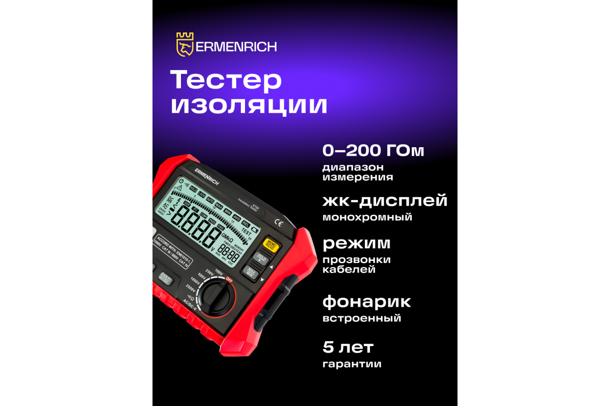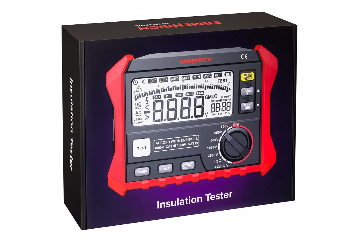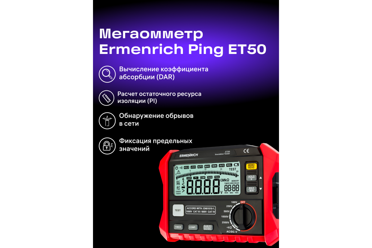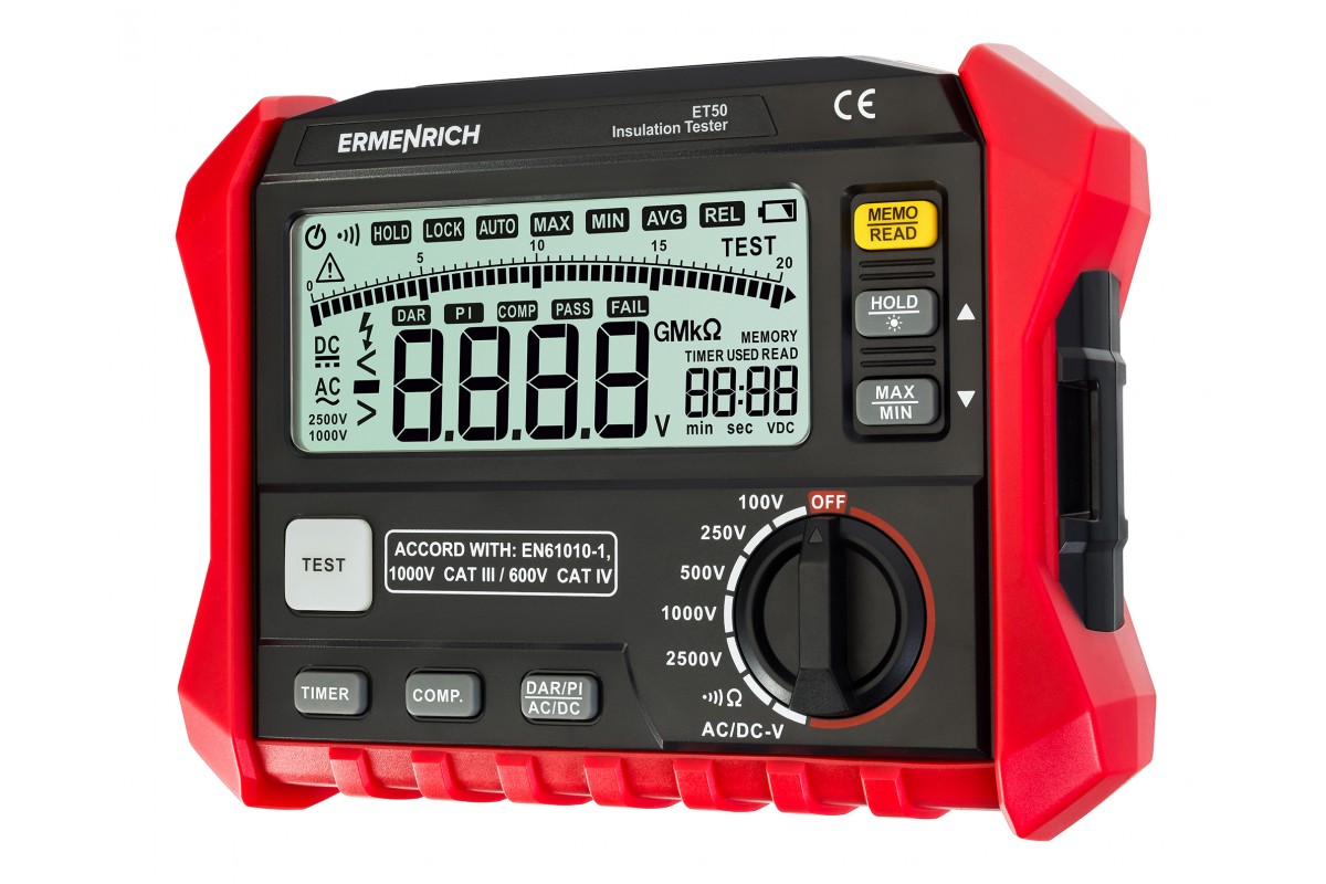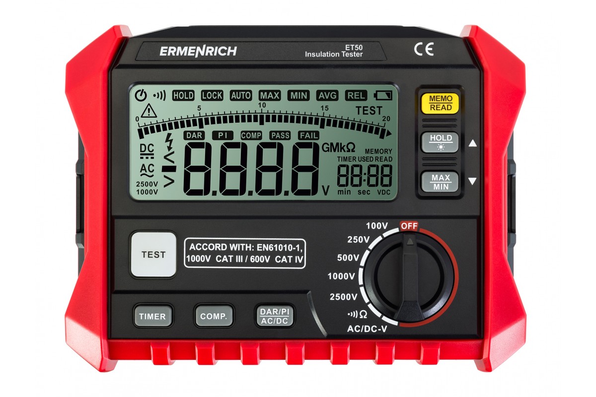 Ermenrich Ping ET50 – мегаомметр (измеритель сопротивления изоляции) с 5 тестовыми напряжениями и верхним пределом измерения 200 ГОм. Предназначен для определения влажности изоляции (коэффициент абсорбции, DAR) и остаточного ресурса (индекс поляризации, PI). Периодические измерения этих параметров позволяют вовремя выявить кабели с поврежденной изоляцией, выполнить просушку или замену и предотвратить короткие замыкания и возгорания в электросетях.