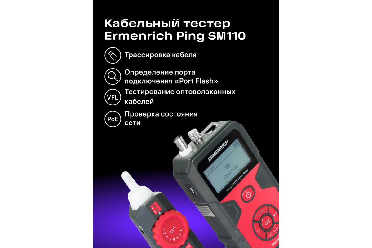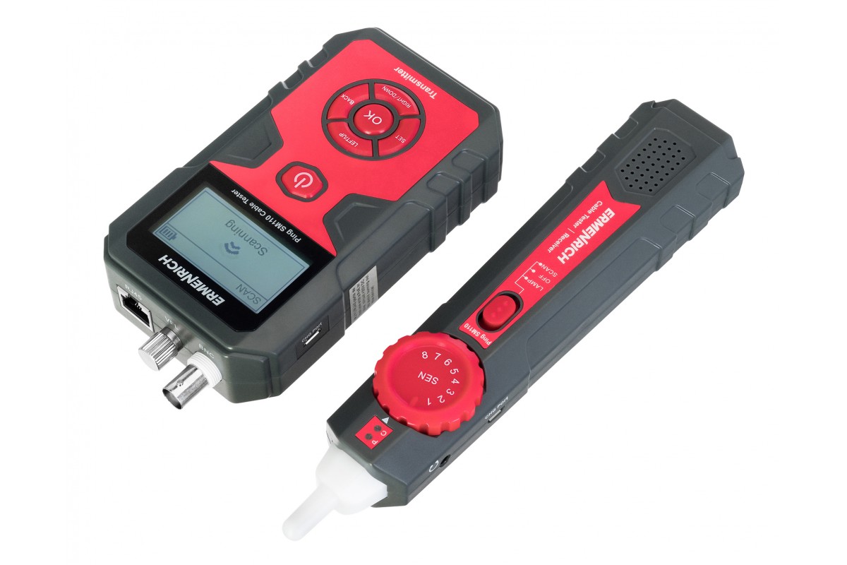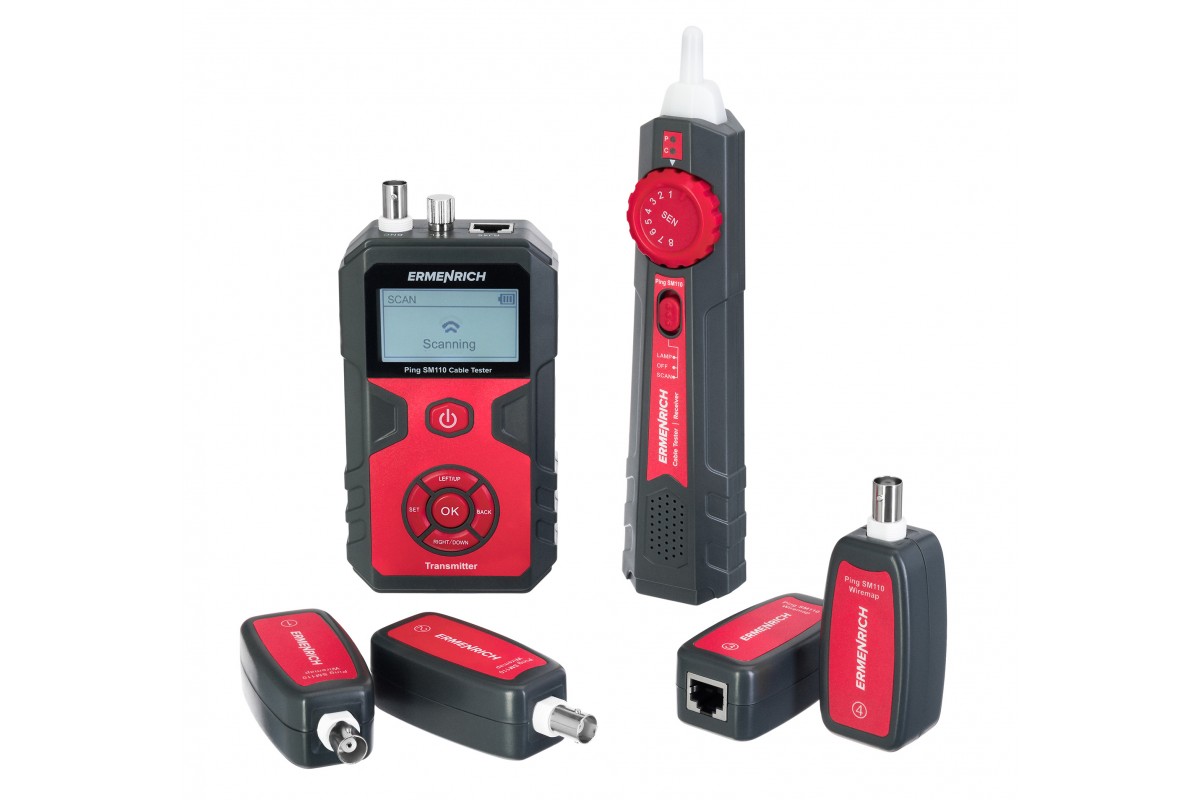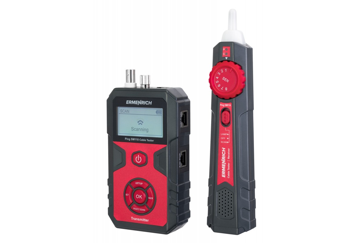 Модель Ermenrich Ping SM110 подходит для диагностики кабелей длиной до 2000 м. Во внутреннюю память можно сохранять до 5 результатов тестирования и измерения. Комплект тестера включает в себя передатчик с дисплеем и кнопками, приемник с регулировкой чувствительности и 4 дистанционных модуля. Кроме того, тестер укомплектован наушниками для работы при сильном шуме, гнездо для подключения наушников находится на приемнике. Приемник и передатчик работают от литиевых аккумуляторов емкостью 1400 мАч. В комплект входит кабель microUSB для зарядки батарей.