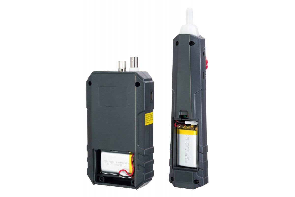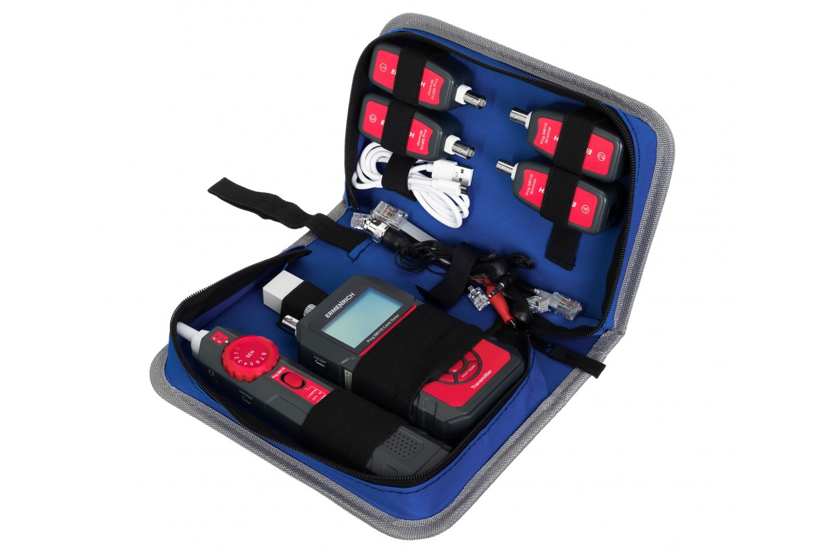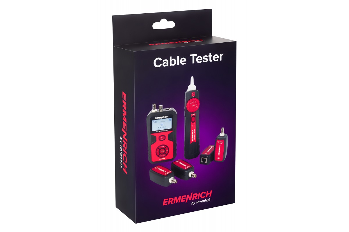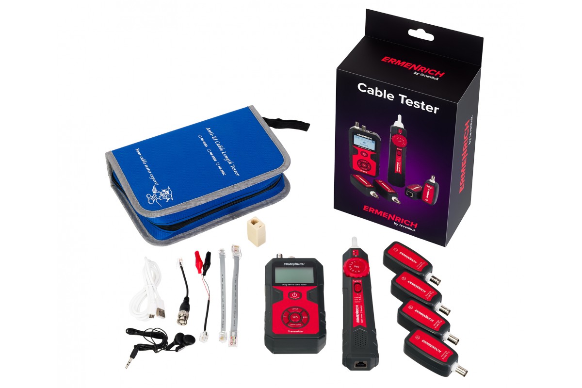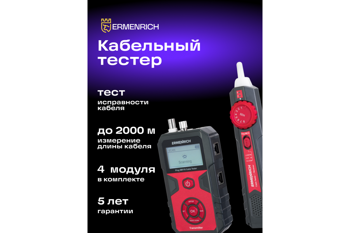 Модель Ermenrich Ping SM110 подходит для диагностики кабелей длиной до 2000 м. Во внутреннюю память можно сохранять до 5 результатов тестирования и измерения. Комплект тестера включает в себя передатчик с дисплеем и кнопками, приемник с регулировкой чувствительности и 4 дистанционных модуля. Кроме того, тестер укомплектован наушниками для работы при сильном шуме, гнездо для подключения наушников находится на приемнике. Приемник и передатчик работают от литиевых аккумуляторов емкостью 1400 мАч. В комплект входит кабель microUSB для зарядки батарей.