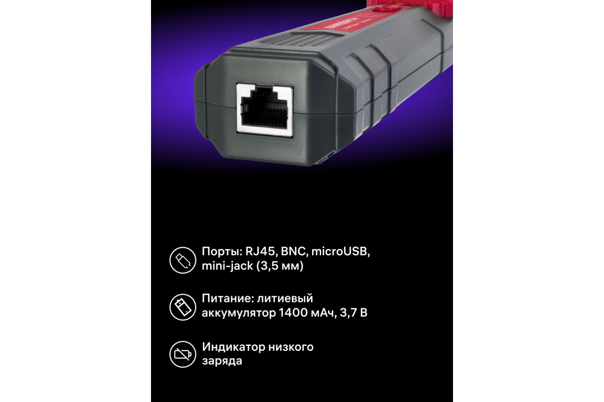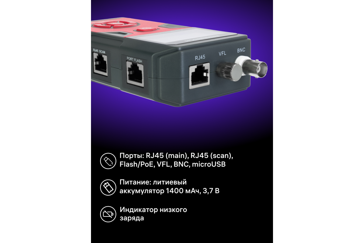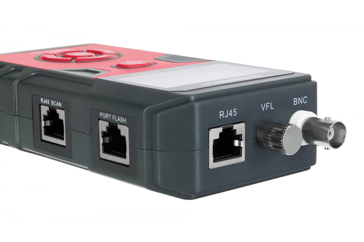 Устройство для тестирования кабельных линий, трассировки, измерения длины кабелей и обнаружения неисправностей. Работает с сетевыми кабелями STP/UTP категорий 5/6, а также с телефонными и коаксиальными кабелями. С помощью тестера можно быстро найти нужный кабель в пучке (функция VFL), определить место обрыва или короткого замыкания, полярность телефонной линии. Есть функция проблесковой индикации (Port Flash) для определения порта, к которому подключен кабель. С помощью теста PoE определяют напряжение на витой паре.