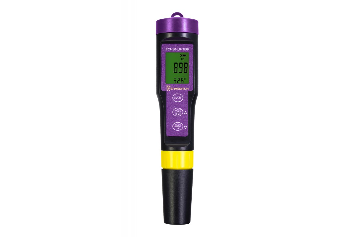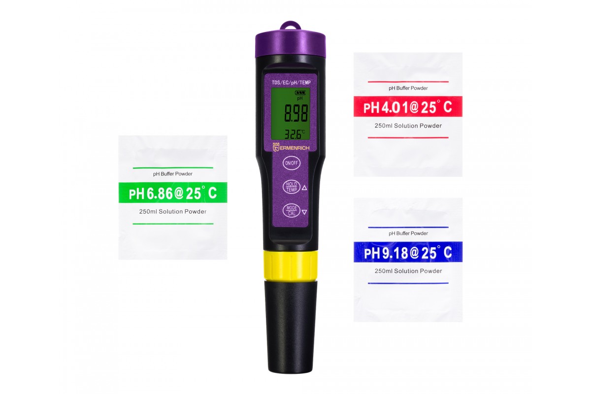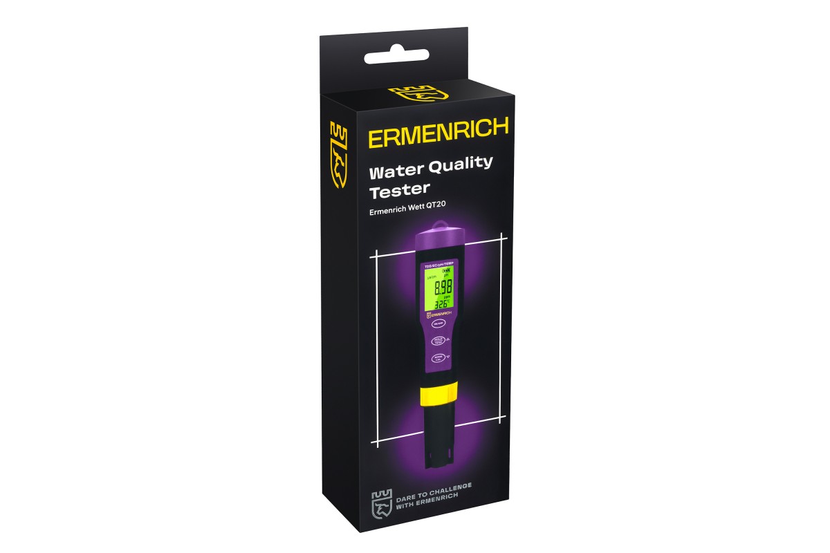 Тестер качества воды Ermenrich Wett QT20 пригодится специалистам, занимающимся контролем качества воды в общественных бассейнах, в плавучих клетках на рыбных фермах, профессионалам в лабораторных условиях, а также любителям, желающим проверить качество воды, используемой для готовки и питья дома. Устройство позволяет оперативно определить 4 главных показателя, характеризующих текущее состояние воды: уровень кислотности (pH), общее количество растворенных частиц (TDS), электропроводность (EC) и температуру. Точность тестирования жидкости обеспечивается возможностью предварительной калибровки Ermenrich Wett QT20 при помощи буферных растворов – для их приготовления в комплекте предусмотрены 3 пакетика-саше со специальными порошками (4,00, 6,86 и 9,18 pH).