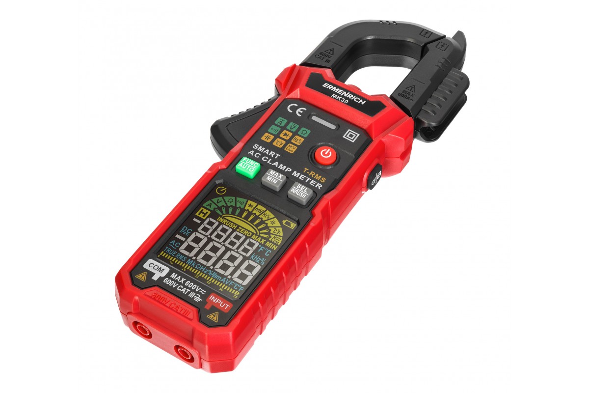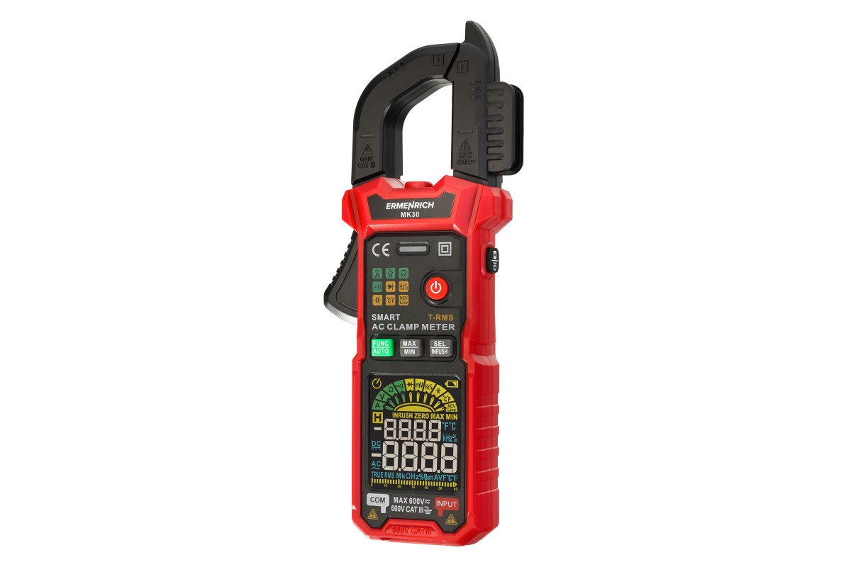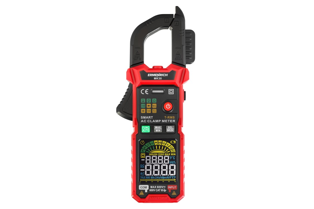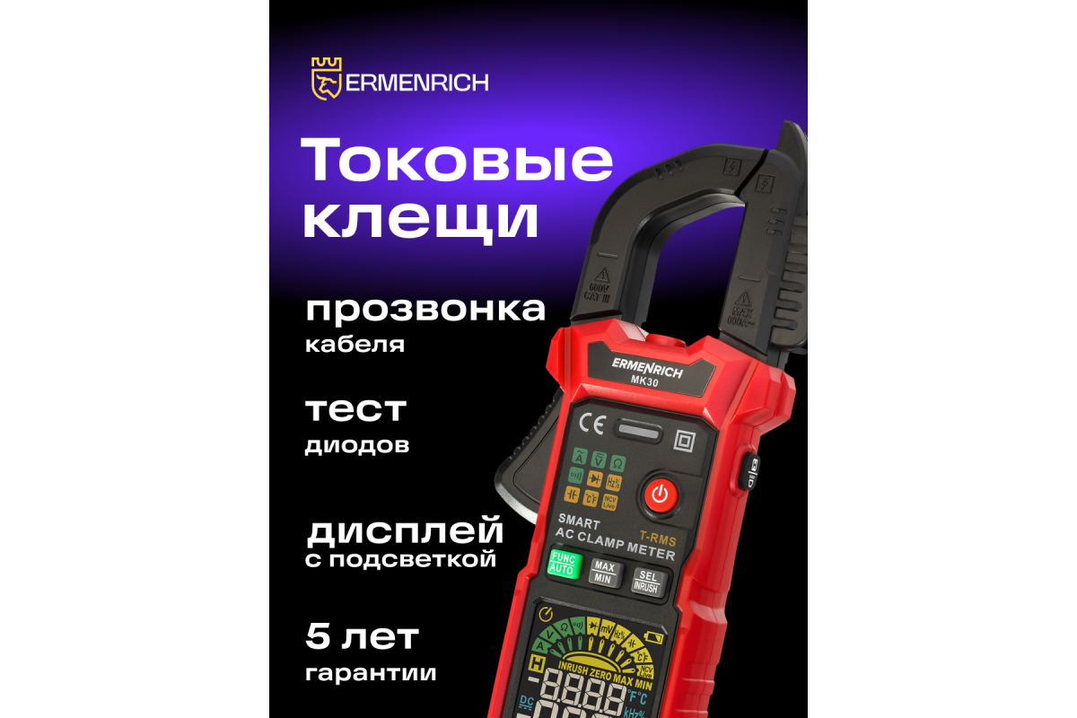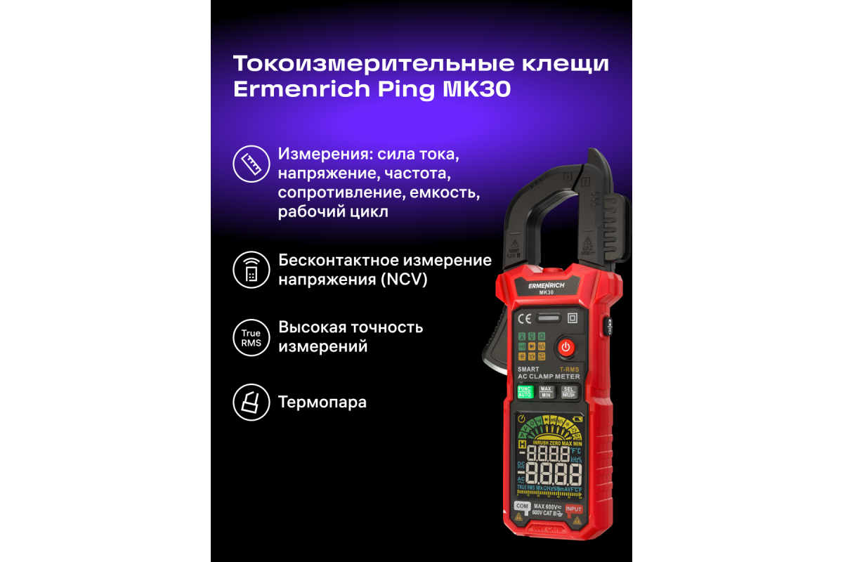 Ermenrich Ping MK30 – многофункциональный измеритель (токовые клещи) для определения силы тока, напряжения, сопротивления, частоты, емкости и рабочего цикла. Измерение тока осуществляется без размыкания электрической цепи, что гораздо удобнее, чем при использовании обычного амперметра. Клещи также имеют функции прозвонки кабелей для поиска обрывов и коротких замыканий, проверки рабочего состояния диодов, бесконтактного определения напряжения (поиска скрытых проводов) и фазы. Благодаря термопаре можно измерять температуру с выбором единицы измерения (°C или °F).