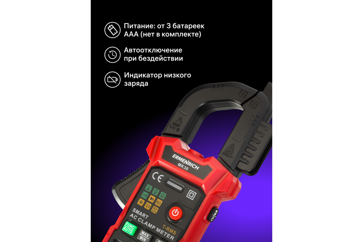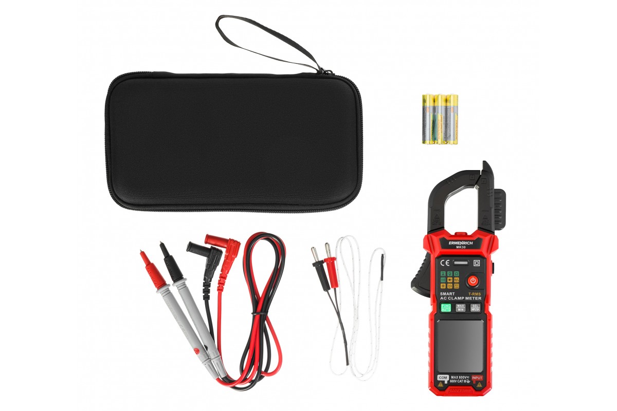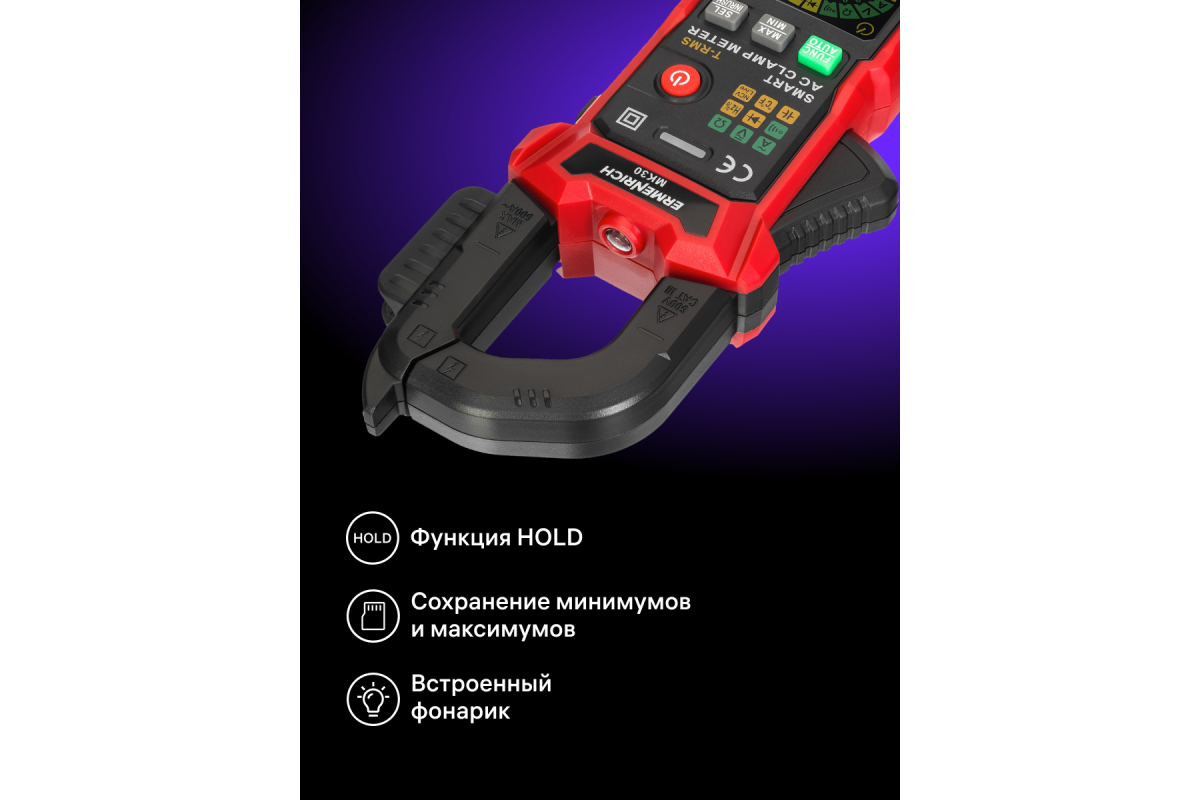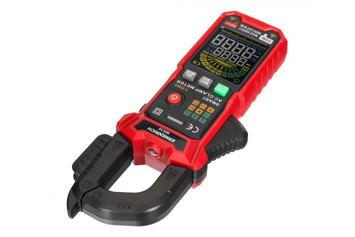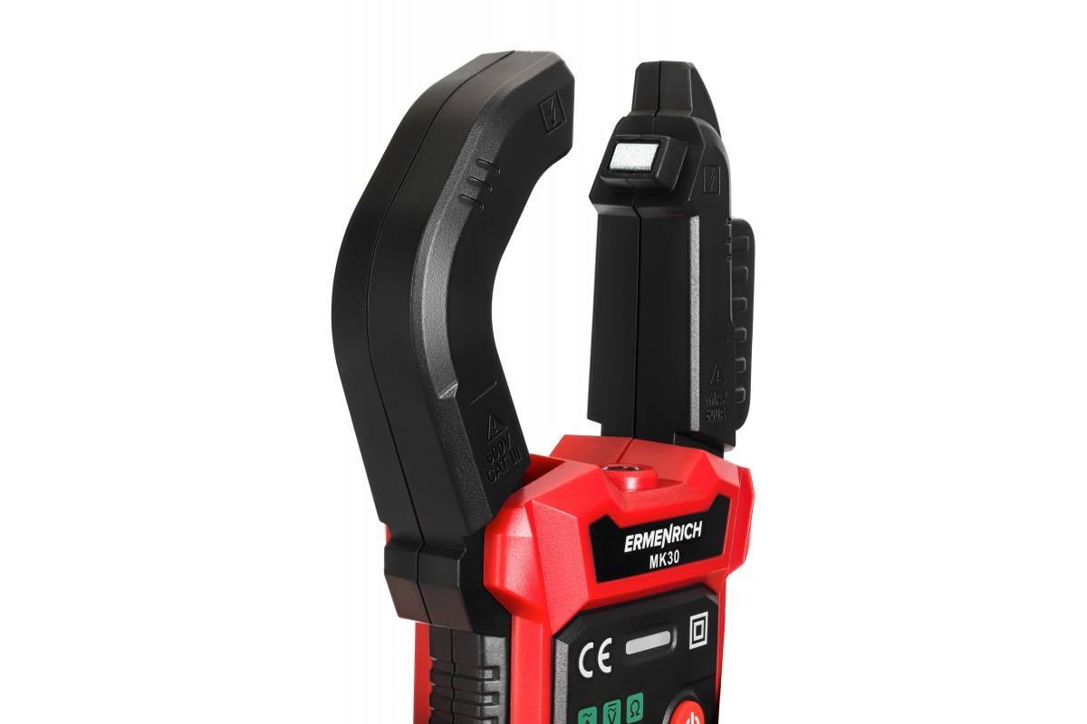 Ermenrich Ping MK30 – многофункциональный измеритель (токовые клещи) для определения силы тока, напряжения, сопротивления, частоты, емкости и рабочего цикла. Измерение тока осуществляется без размыкания электрической цепи, что гораздо удобнее, чем при использовании обычного амперметра. Клещи также имеют функции прозвонки кабелей для поиска обрывов и коротких замыканий, проверки рабочего состояния диодов, бесконтактного определения напряжения (поиска скрытых проводов) и фазы. Благодаря термопаре можно измерять температуру с выбором единицы измерения (°C или °F).