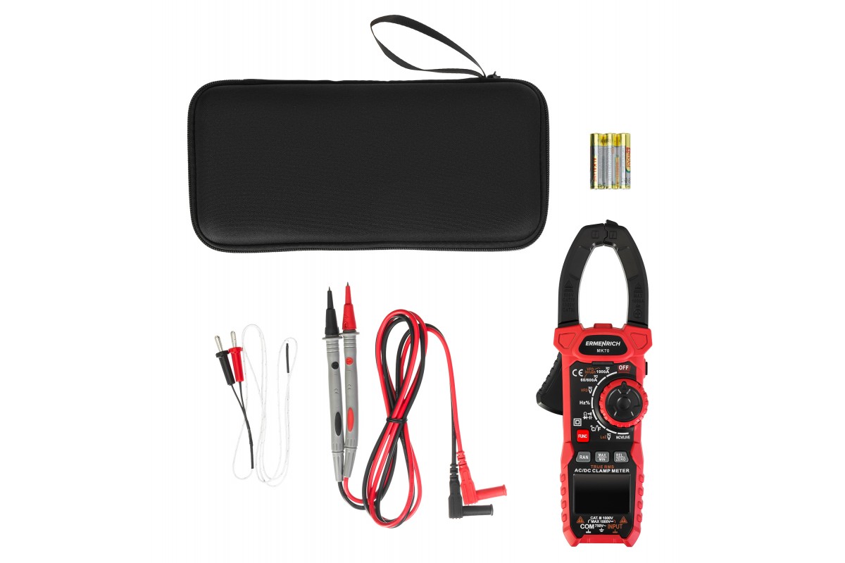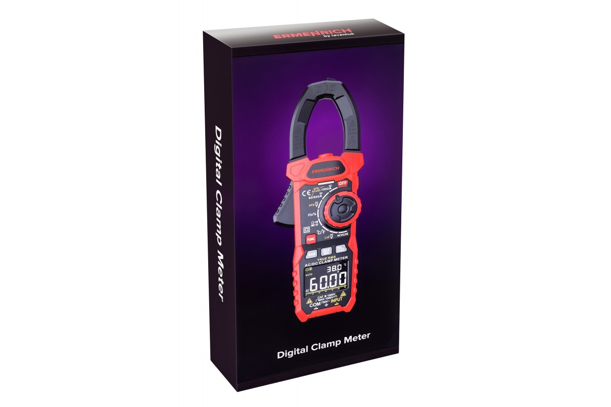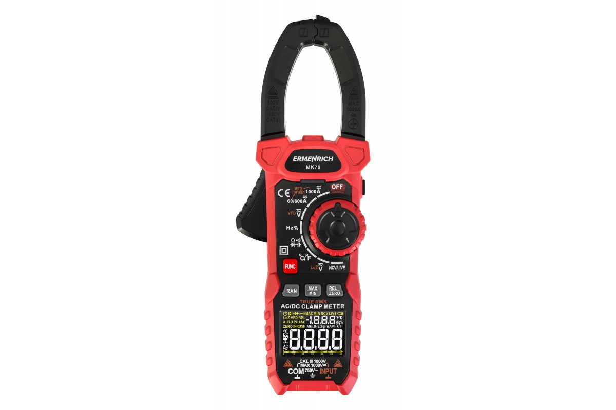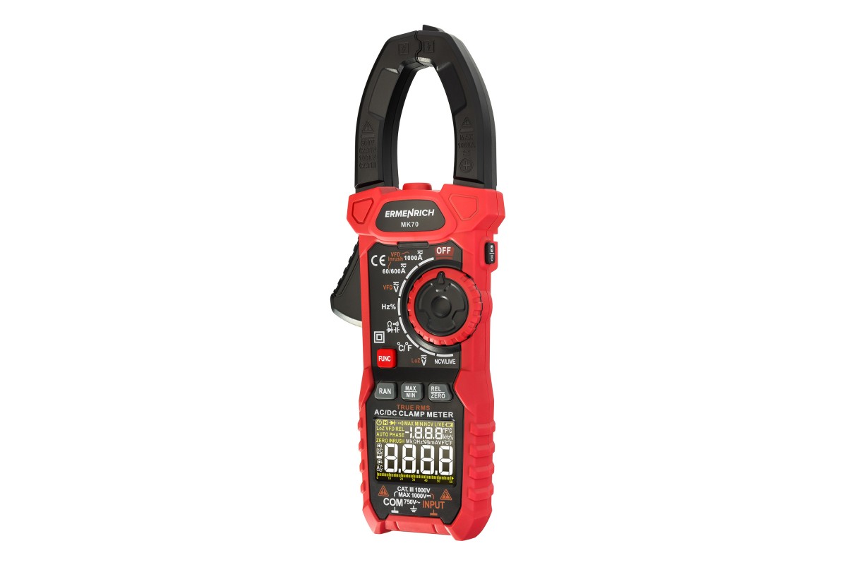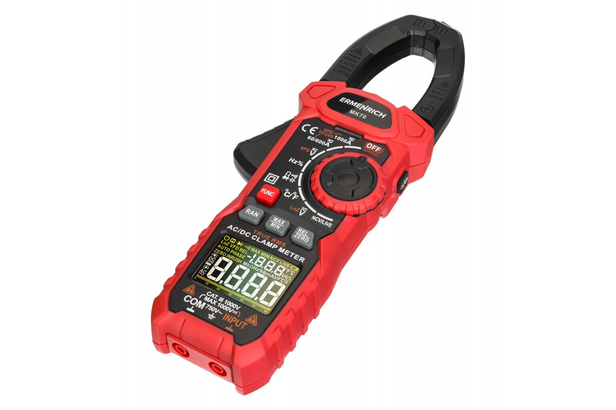 Токоизмерительные клещи Ermenrich Ping MK70 – портативный измерительный прибор для безопасного и быстрого определения силы тока, в том числе постоянного, без разрыва цепи. Этим устройством также можно измерять напряжение, сопротивление, электрическую емкость, частоту, рабочий цикл. Благодаря термопаре можно измерять температуру с отображением результата в °C или °F. С помощью токовых клещей Ermenrich Ping MK70 находят обрывы и короткие замыкания в кабельной линии, пробои и обрывы диодов, обнаруживают провода под напряжением, скрытые в полу или в стене (функция NCV).