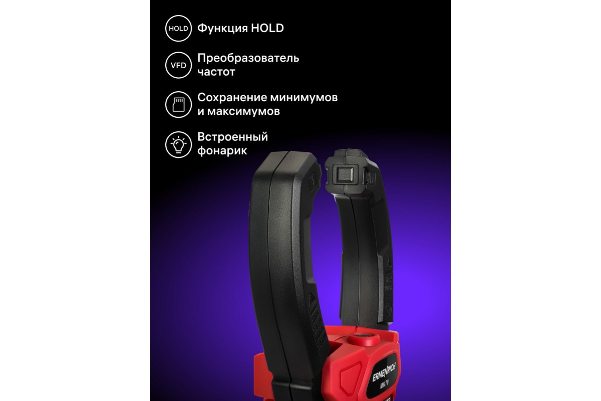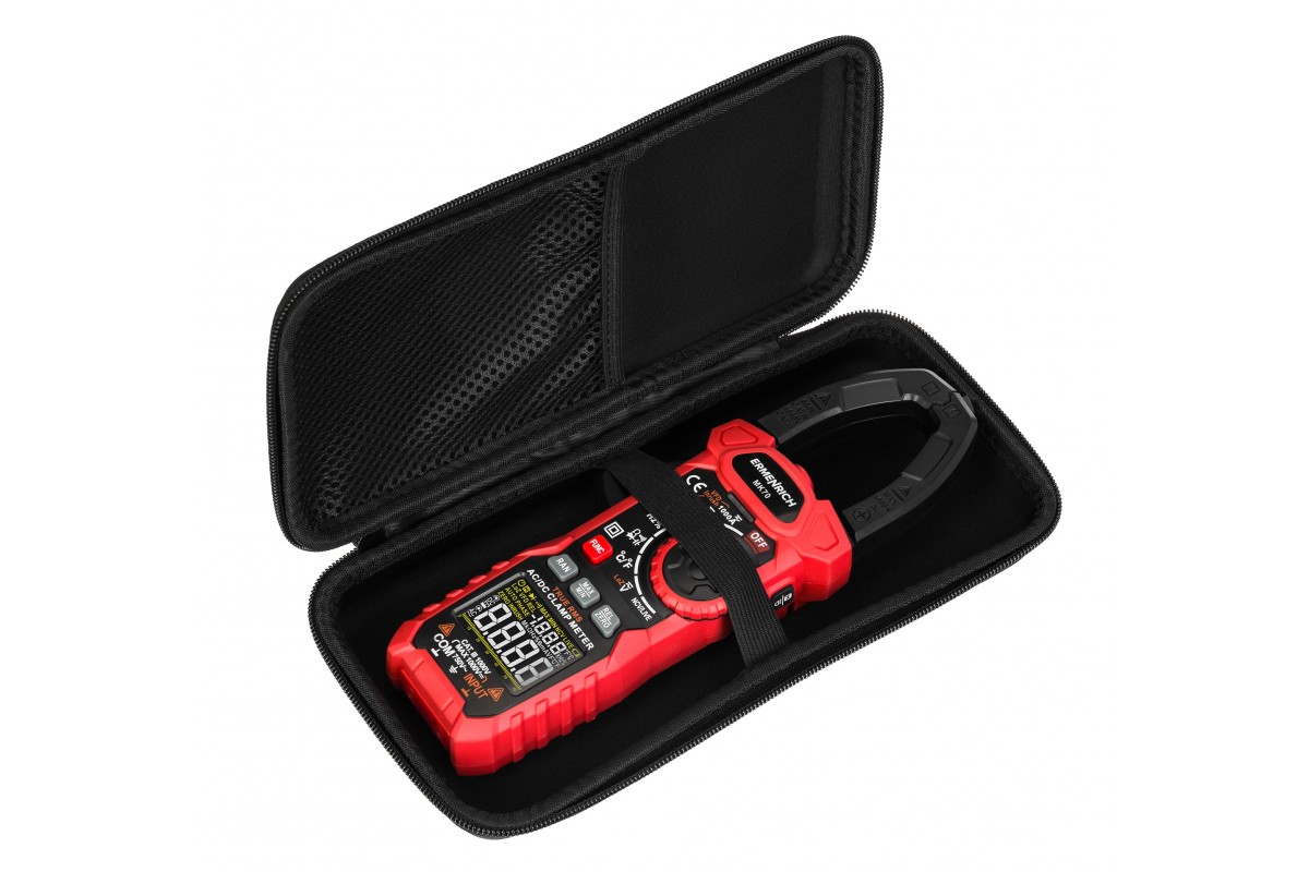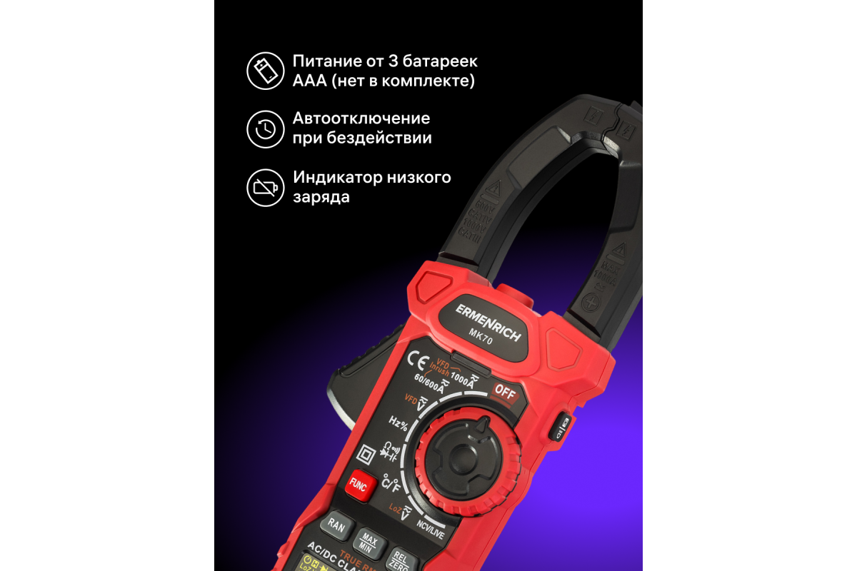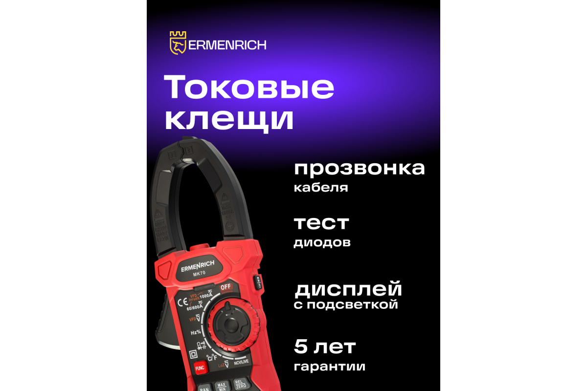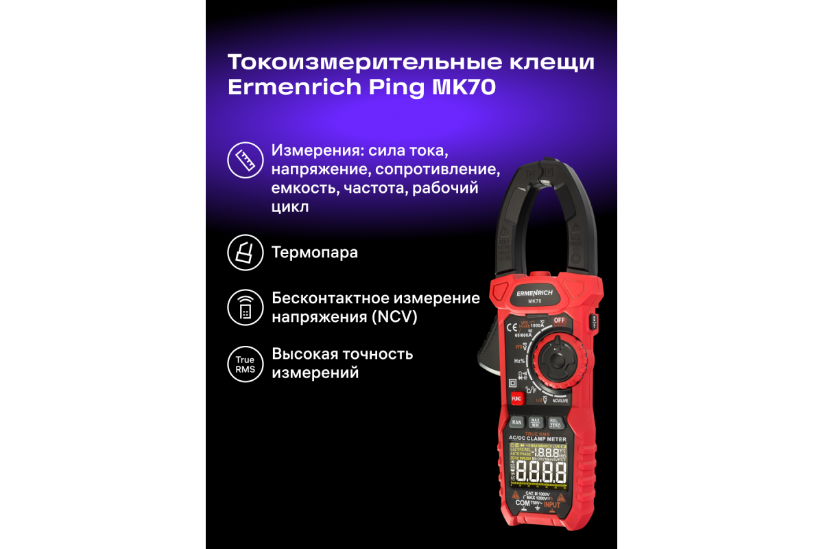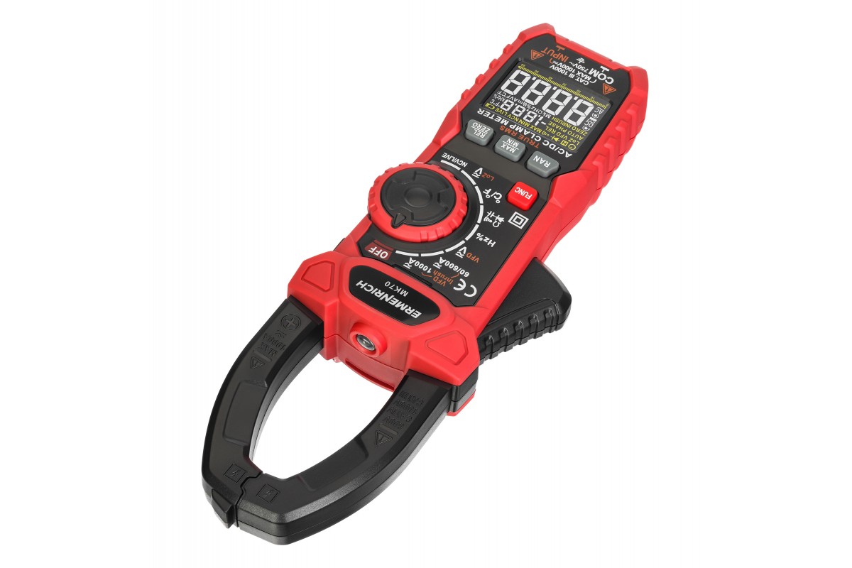 Токоизмерительные клещи Ermenrich Ping MK70 – портативный измерительный прибор для безопасного и быстрого определения силы тока, в том числе постоянного, без разрыва цепи. Этим устройством также можно измерять напряжение, сопротивление, электрическую емкость, частоту, рабочий цикл. Благодаря термопаре можно измерять температуру с отображением результата в °C или °F. С помощью токовых клещей Ermenrich Ping MK70 находят обрывы и короткие замыкания в кабельной линии, пробои и обрывы диодов, обнаруживают провода под напряжением, скрытые в полу или в стене (функция NCV).