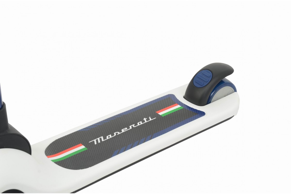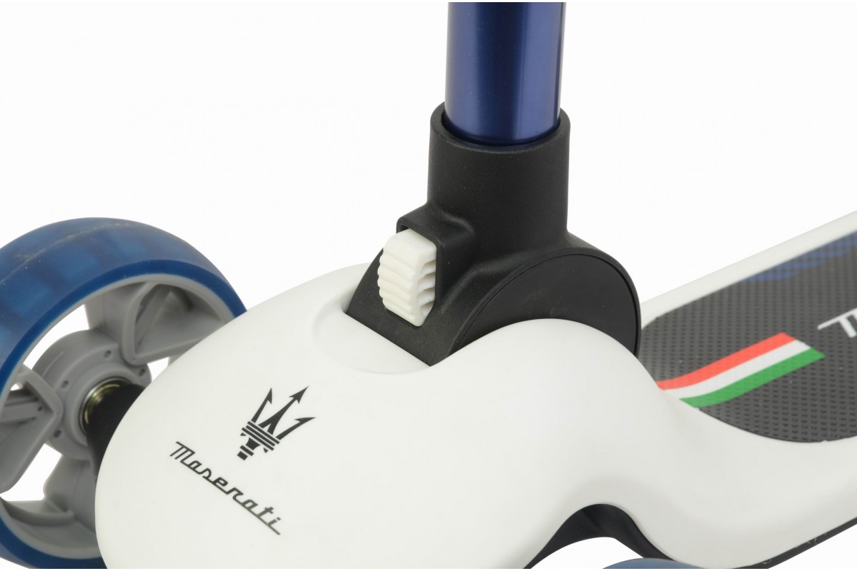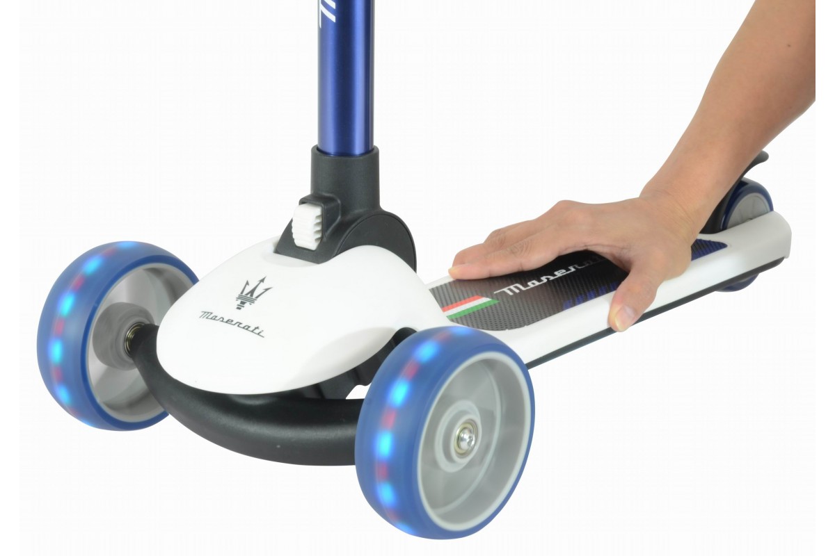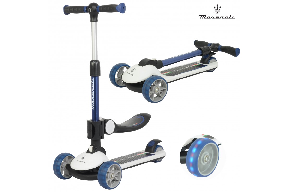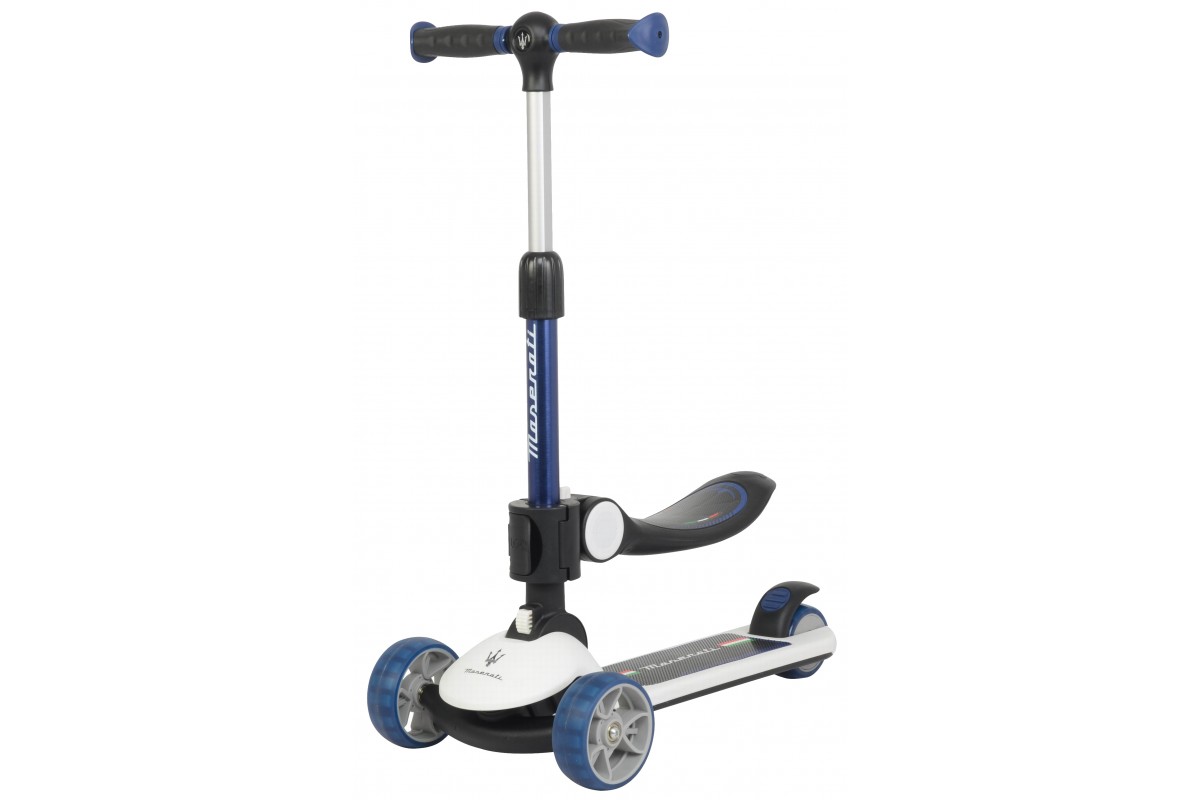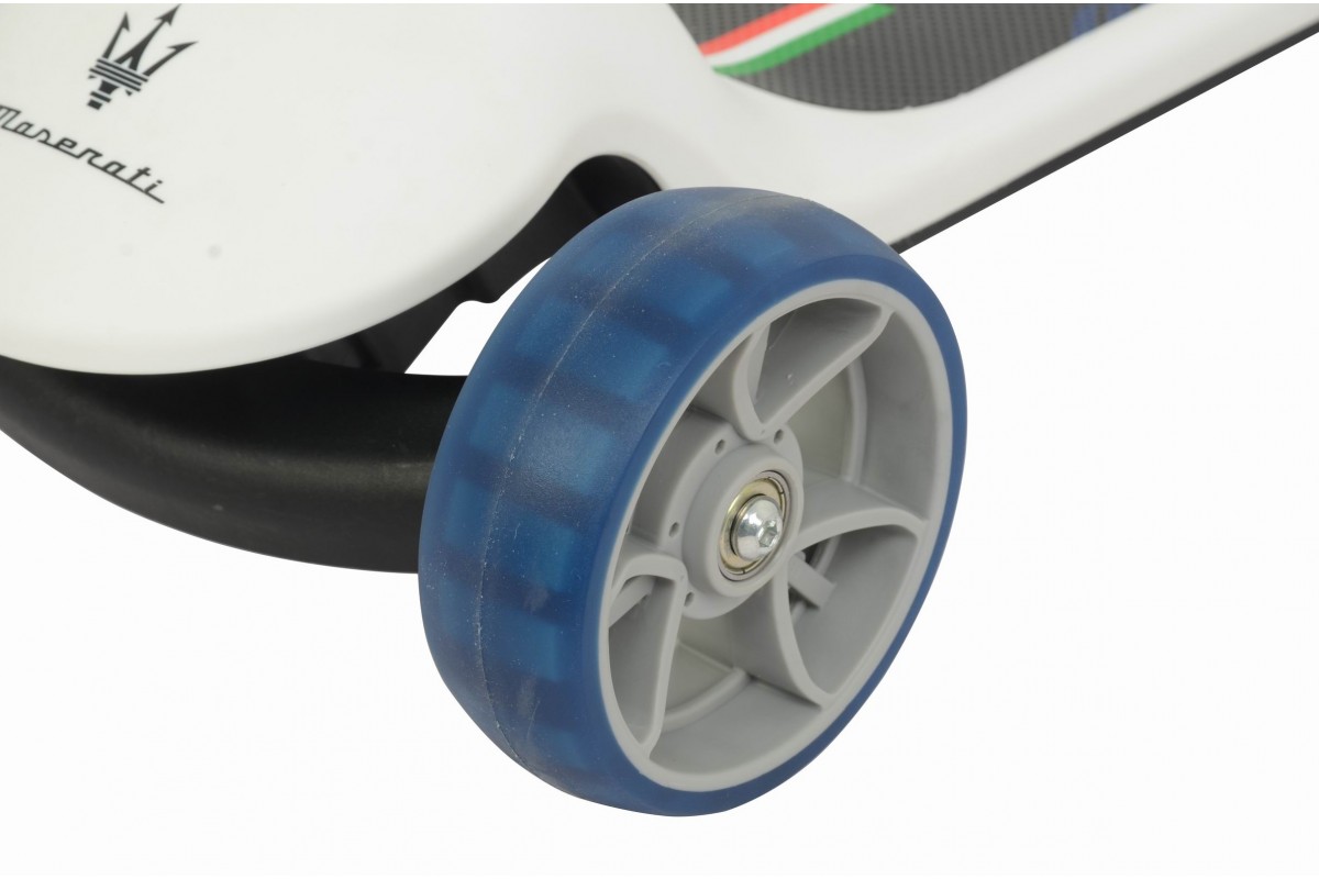 Трехколесный беговел-самокат Maserati с сиденьем - CLB-0140-WHITE - это трехколесный самокат по лицензии компании Maserati с сиденьем, алюминиевым рулем и со светящимися колесами - все, что необходимо для активного отдыха ребенка! Специальная модель трехколесного самоката с сиденьем создана для детишек от 1 года. Модель представляет собой самокат-беговел для малышей, которые только начинают осваивать чудо-технику самокат. Принцип езды на таком самокате такой же, как у беговелов, то есть сел, отталкиваешься двумя ногами и едешь. Сиденье самоката может быть зафиксировано в любой точке рулевой стойки, что позволяет настраивать самокат на различной высоте по мере роста Вашего малыша. А, начиная примерно с 2,5 лет сиденье можно снять и делается это буквально в одно действие, что очень удобно. Контроль за скоростью обеспечит ножной тормоз над задним колесом. А для яркой и запоминающейся езды самокат имеет светящиеся LED колеса нового поколения - светятся снаружи и внутри колеса.